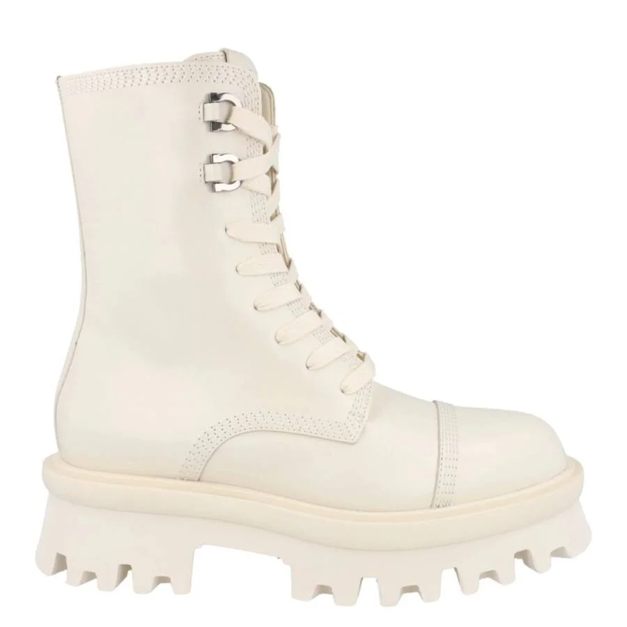 Ferragamo Ladies Boots. SKU: 01F701 763844. Color: White. Ferragamo Kira Combat Boots feature a smooth calfskin leather upper with a classic round toe and ankle-length silhouette. Designed with a top lace-up closure, nickel Gancini eyelets, and a rubber lug sole, they offer both edgy style and durable wear. Elevated with a 3" heel and 2" platform, these boots provide bold, contemporary appeal. Made in Italy. Please visit the brand website for sizing information. INFORMATION Brand: Ferragamo Model: 01F701 763844 Gender: Womens DETAILS Category: Boots Shoe Style: Combat Boots Shoe Style: Combat Boots Color: White Shoe Vamp Style: Lace-up Sole Material: Rubber ADDITIONAL INFO Jomashop Sku: -01F701763844 Department: Shoes