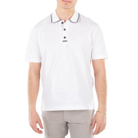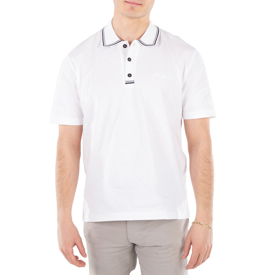 Ferragamo Men's Tops. Fashion category: Polo Shirts. SKU: 122431 776277. Color: White. Ferragamo Organic Cotton Short-Sleeved Polo Shirt. This shirt features a two-tone jacquard design with lines under the placket and around the collar, along with a small tonal embroidered signature. 100% Cotton. Made in Italy. GENERAL Color: White INFORMATION Brand: Ferragamo Gender: Mens Model: 122431 776277 DETAILS Category: Tops Apparel Type: Polo Shirts Material: Cotton ADDITIONAL INFO Jomashop Sku: -122431776277N Department: Clothing
