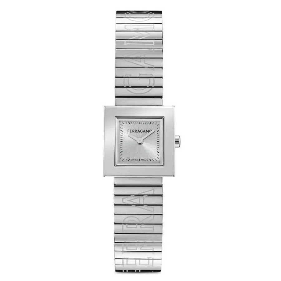 Silver-tone stainless steel case and bracelet. Fixed silver-tone stainless steel bezel. Silver-tone dial with silver-tone hands and index hour markers. Minute markers around the outer rim. Dial Type: Analog. Quartz movement. Scratch resistant sapphire crystal. Pull / push crown. Solid case back. Square case shape, case size: 20 mm. Deployment with push button release clasp. Water resistant at 30 meters / 100 feet. Functions: hour, minute. Portrait Series. Dress watch style. Watch label: Swiss Made. Ferragamo Portrait Quartz Silver Dial Ladies Watch SFJT00425. GENERAL Box Type: Original Box CASE Case Material: Stainless Steel Case Shape: Square Case Back: Solid BAND Band Material: Stainless Steel Band Type: Bracelet Band Color: Silver-tone Clasp: Deployment with Push Button Release DIAL Dial Color: Silver-tone Type: Analog Crystal: Scratch Resistant Sapphire Hands: Silver-tone Dial Markers: Index Second Markers: Minute Markers around the outer rim Bezel: Fixed Bezel Color: Silver-tone Bezel Material: Stainless Steel Crown: Pull / Push INFORMATION Brand: Ferragamo Series: Portrait Collection Name: Portrait Gender: Womens Model: SFJT00425 Watch Label: Swiss Made Movement: Quartz FEATURES Water Resistance: 30 meters / 100 feet Functions: Hour, Minute Watch Features: Stainless Steel, Analog ADDITIONAL INFO Watch Style: Dress Warranty: 2 Year Jomashop Warranty Jomashop Sku: FR-SFJT00425 Department: Watches