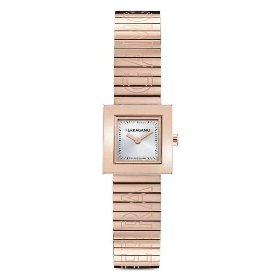 Rose gold-tone stainless steel case and bracelet. Fixed rose gold-tone stainless steel bezel. Silver dial with rose gold-tone hands and index hour markers. Minute markers around the outer rim. Dial Type: Analog. Quartz movement. Scratch resistant sapphire crystal. Pull / push crown. Solid case back. Square case shape, case size: 20 mm. Deployment with push button release clasp. Water resistant at 30 meters / 100 feet. Functions: hour, minute. Portrait Series. Dress watch style. Watch label: Swiss Made. Ferragamo Portrait Quartz Silver Dial Ladies Watch SFJT00625. GENERAL Box Type: Original Box CASE Case Material: Stainless Steel Case Shape: Square Case Back: Solid BAND Band Material: Stainless Steel Band Type: Bracelet Band Color: Rose Gold-tone Clasp: Deployment with Push Button Release DIAL Dial Color: Silver Type: Analog Crystal: Scratch Resistant Sapphire Hands: Rose Gold-tone Dial Markers: Index Second Markers: Minute Markers around the outer rim Bezel: Fixed Bezel Color: Rose Gold-tone Bezel Material: Stainless Steel Crown: Pull / Push INFORMATION Brand: Ferragamo Series: Portrait Collection Name: Portrait Gender: Womens Model: SFJT00625 Watch Label: Swiss Made Movement: Quartz FEATURES Water Resistance: 30 meters / 100 feet Functions: Hour, Minute Watch Features: Analog, Gold, Stainless Steel ADDITIONAL INFO Watch Style: Dress Warranty: 2 Year Jomashop Warranty Jomashop Sku: FR-SFJT00625 Department: Watches
