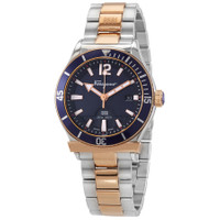 Stainless steel case with a two tone (silver-tone and rose gold-tone) stainless steel bracelet. Uni-directional rotating rtose gold-tone bezel with an inlad blue aluminium ring. Blue dial with luminous rose gold-tone hands and index hour markers. An Arabic numeral appears at the 12 o'clock position. Minute markers around the outer rim. Dial Type: Analog. Luminescent hands and markers. Date display at the 3 o'clock position. Quartz movement. Scratch resistant sapphire crystal. Screw down crown. Solid case back. Round case shape. Case size: 43 mm. Case thickness: 11 mm. Deployment with push button release clasp. Water resistant at 200 meters / 660 feet. Functions: date, hour, minute, second. Sport watch style. Watch label: Swiss Made. Ferragamo Quartz Blue Dial Men's Watch SFFN00120. GENERAL Box Type: Original Box CASE Case Diameter: 43 mm Case Thickness: 11 mm Case Material: Stainless Steel Case Shape: Round Case Back: Solid BAND Band Material: Stainless Steel Band Type: Bracelet Band Color: Two tone (Silver-tone and Rose Gold-tone) Clasp: Deployment with Push Button Release DIAL Dial Color: Blue Type: Analog Crystal: Scratch Resistant Sapphire Hands: Luminous Rose Gold-tone Dial Markers: Index Second Markers: Arabic Numeral appears at the 12 o'clock position. Minute Markers around the outer rim Luminiscence: Hands and Markers Bezel: Uni-directional Rotating Bezel Color: Rose Gold-tone Bezel Material: Stainless Steel with an inlad Blue Aluminium Ring Crown: Screw Down INFORMATION Brand: Ferragamo Gender: Mens Model: SFFN00120 Watch Label: Swiss Made Movement: Quartz FEATURES Water Resistance: 200 meters / 660 feet Calendar: Date display at the 3 o'clock position Functions: Date, Hour, Minute, Second Watch Features: Analog, Gold, Stainless Steel ADDITIONAL INFO Watch Style: Sport Warranty: 2 Year Jomashop Warranty UPC Code: 195768283922 Jomashop Sku: FR-SFFN00120 Department: Watches Category: Watches