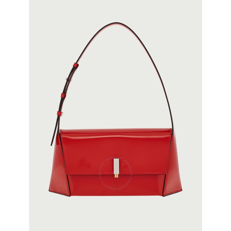 Ferragamo Ladies Shoulder Bag. SKU: 213451 760574. Barcode: 8056283100878. Color: Red. A new take on the shoulder bag flaunting geometric lines and sculptural allure. Crafted from brushed calfskin, it features an understated construction with adjustable shoulder strap, metal fastening with Gancini profile and double flat pocket on the interior to hold your personal belongings. height 15.5 CM length 32.0 CM width 9.5 CM. Shoulder strap length: 24 cm. Composition: calfskin. Made In Italy. GENERAL Color: Red INFORMATION Brand: Ferragamo Gender: Womens Model: 213451 760574 ADDITIONAL INFO UPC Code: 8056283100878 Jomashop Sku: Z-F7VJX Department: Bags Category: Shoulder Bag