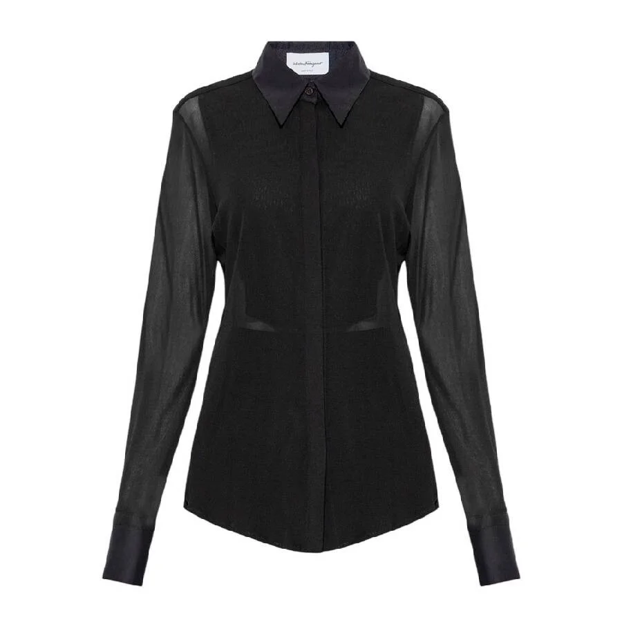 Ferragamo Ladies Tops. Fashion category: Shirts & Blouses. SKU: 13A336 759063. Color: Black. Ferragamo Semi Sheer Long Sleeve Shirt. This shirt features a flowing, sheer black viscose fabric with a feminine, fitted cut, highlighted by a covered placket and long sleeves adorned with antique gold-tone jewelry buttons at the cuffs. The collar and cuffs are crafted with a double layer of fabric, creating a captivating tonal effect that adds depth and sophistication to the design. 100% Viscose. Made in Italy. GENERAL Size Info: 8 Clothing Size: Ladies Apparel Size: 8 Color: Black INFORMATION Brand: Ferragamo Gender: Womens Model: 13A336 759063 DETAILS Category: Tops Apparel Type: Shirts & Blouses Material: Viscose ADDITIONAL INFO UPC Code: 8056283051422 Jomashop Sku: Z-TPJQ7 Department: Clothing