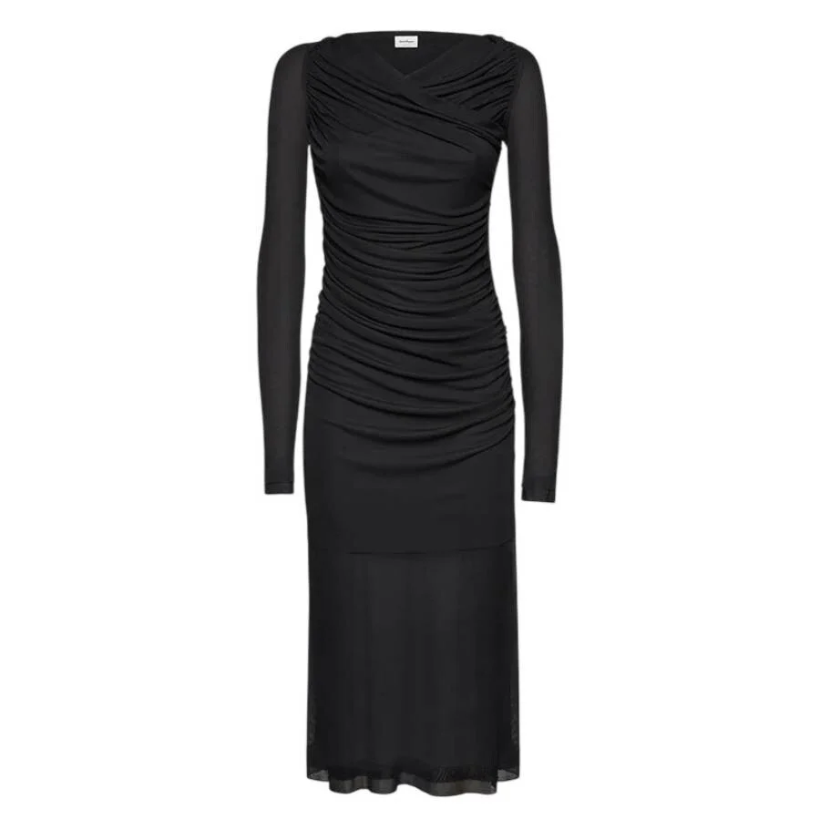 Ferragamo Ladies Dresses. Fashion category: Cocktail & Party Dresses. SKU: 135251 750759. Color: Black. Ferragamo Sheer-Panels Draped Midi Dress. Dress crafted from fluid viscose jersey, featuring a wrapped, draped front with a sensual, toga-inspired effect. Finished with sheer viscose sleeves and a sheer lower skirt for added movement and elegance. 100% Viscose. Made in Italy. GENERAL Color: Black INFORMATION Brand: Ferragamo Gender: Womens Model: 135251 750759 DETAILS Category: Dresses Apparel Type: Cocktail & Party Dresses Material: Viscose ADDITIONAL INFO Jomashop Sku: -135251750759N Department: Clothing