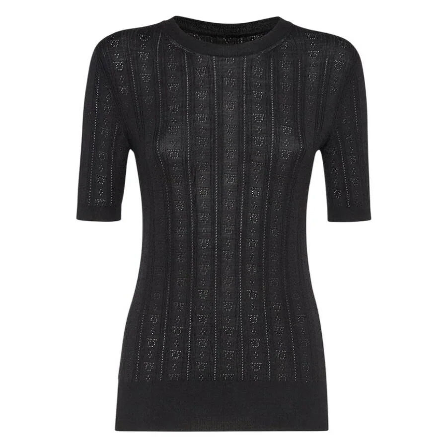 Ferragamo Ladies Tops. Fashion category: Shirts & Blouses. SKU: 110965 751542. Color: Black. Ferragamo Short-Sleeved Gancini Motif Knit Top. Short-sleeved round-neck knit top featuring the iconic Gancini motif. Crafted in lightweight micro ajour wool for a refined and comfortable fit. Material: 100% Wool. Made in Italy. GENERAL Color: Black INFORMATION Brand: Ferragamo Gender: Womens Model: 110965 751542 DETAILS Category: Tops Apparel Type: Shirts & Blouses Material: Wool ADDITIONAL INFO Jomashop Sku: -110965751542N Department: Clothing