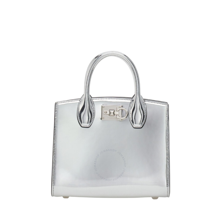 Ferragamo Ladies Tote. SKU: 211424 763291. Material: Calfskin;Lambskin. Color: Silver. Size: W:22cm x H:19cm x D:11cm. Ferragamo Small Studio Box Gancini Buckle Tote Bag. This tote bag is crafted from lambskin and features a Gancini buckle, two rolled top handles, an internal slip pocket, and a removable shoulder strap. Outer: 100% calfskin, Lining: 100% lambskin. Made in Italy. GENERAL Size Info: W:22cm x H:19cm x D:11cm Color: Silver INFORMATION Brand: Ferragamo Gender: Womens Model: 211424 763291 DETAILS Material: Calfskin, Lambskin ADDITIONAL INFO UPC Code: 8056283177535 Jomashop Sku: Z-JKW2W Department: Bags Category: Tote Bags