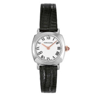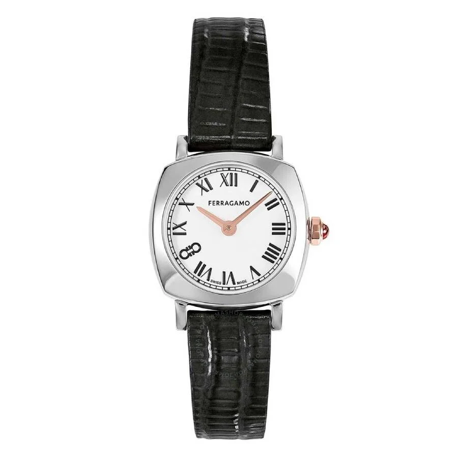 Silver-tone stainless steel case with a black leather strap. Fixed silver-tone stainless steel bezel. White dial with rose gold-tone hands and Roman numeral hour markers. Double gancini at the 8 o'clock position. Minute markers around the outer rim. Dial Type: Analog. Quartz movement. Scratch resistant sapphire crystal. Pull / push crown. Solid case back. Cushion case shape, case size: 23 mm. Buckle clasp. Water resistant at 30 meters / 100 feet. Functions: hour, minute. Soft Square Series. Casual watch style. Watch label: Swiss Made. Ferragamo Soft Square Quartz White Dial Ladies Watch SFKU00123. CASE Case Size: 23 Case Material: Stainless Steel Case Shape: Cushion Case Back: Solid BAND Band Material: Leather Band Type: Strap Band Color: Black Clasp: Buckle DIAL Dial Color: White Type: Analog Crystal: Scratch Resistant Sapphire Hands: Rose Gold-tone Dial Markers: Roman Numeral Second Markers: Double Gancini at the 8 o'clock position. Minute Markers around the outer rim Bezel: Fixed Bezel Color: Silver-tone Bezel Material: Stainless Steel Crown: Pull / Push INFORMATION Brand: Ferragamo Series: Soft Square Collection Name: Soft Square Gender: Womens Model: SFKU00123 Watch Label: Swiss Made Movement: Quartz FEATURES Water Resistance: 30 meters / 100 feet Functions: Hour, Minute Watch Features: Stainless Steel, Leather, Gold, Analog ADDITIONAL INFO Watch Style: Casual Jomashop Sku: FR-SFKU00123 Department: Watches