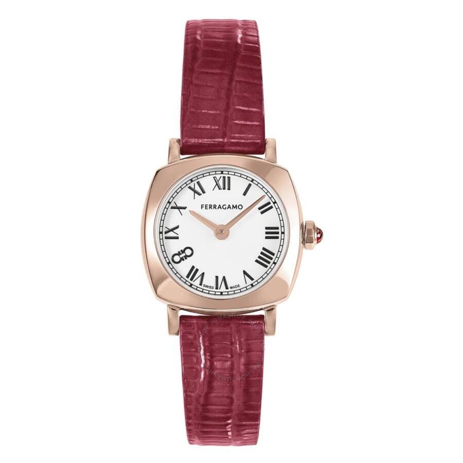 Rose gold-tone stainless steel case with a red leather strap. Fixed rose gold-tone stainless steel bezel. White dial with rose gold-tone hands and Roman numeral hour markers. Double gancini at the 8 o'clock position. Minute markers around the outer rim. Dial Type: Analog. Quartz movement. Scratch resistant sapphire crystal. Pull / push crown. Solid case back. Cushion case shape, case size: 23 mm. Buckle clasp. Water resistant at 30 meters / 100 feet. Functions: hour, minute. Soft Square Series. Casual watch style. Watch label: Swiss Made. Ferragamo Soft Square Quartz White Dial Ladies Watch SFKU00323. CASE Case Size: 23 Case Material: Stainless Steel Case Shape: Cushion Case Back: Solid BAND Band Material: Leather Band Type: Strap Band Color: Red Clasp: Buckle DIAL Dial Color: White Type: Analog Crystal: Scratch Resistant Sapphire Hands: Rose Gold-tone Dial Markers: Roman Numeral Second Markers: Double Gancini at the 8 o'clock position. Minute Markers around the outer rim Bezel: Fixed Bezel Color: Rose Gold-tone Bezel Material: Stainless Steel Crown: Pull / Push INFORMATION Brand: Ferragamo Series: Soft Square Collection Name: Soft Square Gender: Womens Model: SFKU00323 Watch Label: Swiss Made Movement: Quartz FEATURES Water Resistance: 30 meters / 100 feet Functions: Hour, Minute Watch Features: Stainless Steel, Leather, Gold, Analog ADDITIONAL INFO Watch Style: Casual Jomashop Sku: FR-SFKU00323 Department: Watches