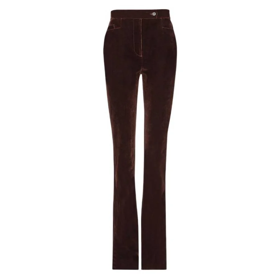 Ferragamo Ladies Bottoms. Fashion category: Pants & Leggings. SKU: 13C798 771274. Color: Dark Brown. Ferragamo Straight-Leg Flock Velvet Trouser. These flock velvet trousers blend the softness of velvet with a denim-inspired attitude. Designed with a straight leg, they feature an asymmetric tab fastening and button for a graphic touch, along with a back welt pocket secured by a button. 82% Cotton, 16% Viscose, 2% Spandex. Made in Italy. GENERAL Color: Dark Brown INFORMATION Brand: Ferragamo Gender: Womens Model: 13C798 771274 DETAILS Category: Bottoms Apparel Type: Pants & Leggings Material: Cotton, Spandex, Viscose ADDITIONAL INFO Jomashop Sku: -13C798771274 Department: Clothing