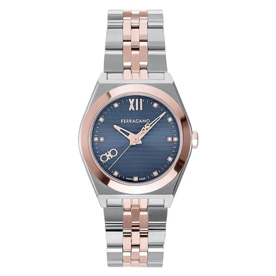 Silver-tone stainless steel case with a two-tone (silver-tone and rose gold-tone) stainless steel bracelet. Fixed rose gold-tone stainless steel bezel. Blue dial with rose gold-tone hands and diamond-Roman numeral hour markers. Gancini logo detail at 8 o'clock position. Minute scale around the inner rim. Dial Type: Analog. Quartz movement. Scratch resistant sapphire crystal. Pull / push crown. Solid case back. Round case shape, case size: 28 mm. Band width: 14 mm. Deployment with push button release clasp. Water resistant at 30 meters / 100 feet. Functions: hour, minute, second. Vega New Series. Dress watch style. Watch label: Swiss Made. Ferragamo Vega New Quartz Diamond Blue Dial Ladies Watch SFKJ00824. GENERAL Box Type: Original Box CASE Case Material: Stainless Steel Case Shape: Round Case Back: Solid BAND Band Material: Stainless Steel Band Type: Bracelet Band Color: Two-tone (Silver-tone and Rose Gold-tone) Band Width: 14 mm Clasp: Deployment with Push Button Release DIAL Dial Color: Blue Type: Analog Crystal: Scratch Resistant Sapphire Hands: Rose Gold-tone Dial Markers: Diamond-Roman Numeral Second Markers: Gancini logo detail at 8 o'clock position. Minute Scale around the inner rim Bezel: Fixed Bezel Color: Rose Gold-tone Bezel Material: Stainless Steel Crown: Pull / Push INFORMATION Brand: Ferragamo Series: Vega New Collection Name: Vega New Gender: Womens Model: SFKJ00824 Watch Label: Swiss Made Movement: Quartz FEATURES Water Resistance: 30 meters / 100 feet Functions: Hour, Minute, Second Watch Features: Analog, Gold, Stainless Steel, Diamond ADDITIONAL INFO Watch Style: Dress Warranty: 2 Year Jomashop Warranty Jomashop Sku: FR-SFKJ00824 Department: Watches