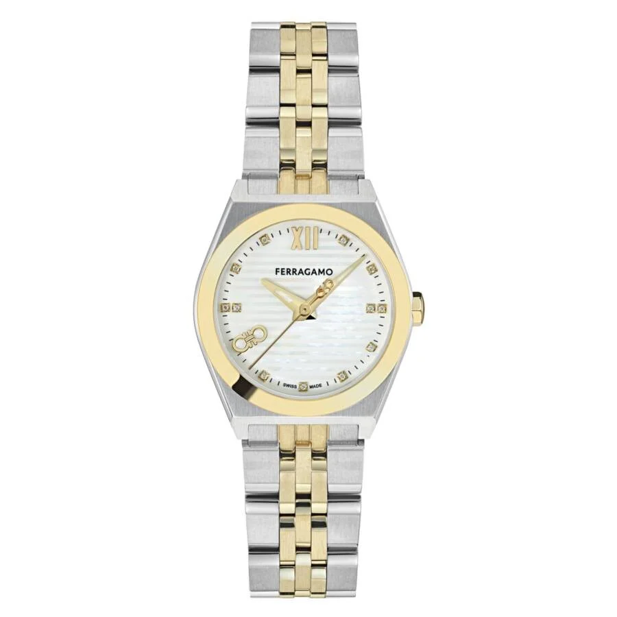 Silver-tone stainless steel case with a two-tone (silver-tone and gold-tone) stainless steel bracelet. Fixed gold-tone stainless steel bezel. Mother of pearl dial with gold-tone hands and diamond-Roman numeral hour markers. Roman numeral marker appears at the 12 o'clock position. Minute scale around the inner rim. Dial Type: Analog. Quartz movement. Scratch resistant sapphire crystal. Pull / push crown. Solid case back. Round case shape, case size: 28 mm. Band width: 14 mm. Deployment with push button release clasp. Water resistant at 30 meters / 100 feet. Functions: hour, minute, second. Vega New Series. Dress watch style. Watch label: Swiss Made. Ferragamo Vega New Quartz Diamond Ladies Watch SFKJ01324. GENERAL Box Type: Original Box CASE Case Material: Stainless Steel Case Shape: Round Case Back: Solid BAND Band Material: Stainless Steel Band Type: Bracelet Band Color: Two-tone (Silver-tone and Gold-tone) Band Width: 14 mm Clasp: Deployment with Push Button Release DIAL Dial Color: Mother of Pearl Type: Analog Crystal: Scratch Resistant Sapphire Hands: Gold-tone Dial Markers: Diamond-Roman Numeral Second Markers: Roman Numeral marker appears at the 12 o'clock position. Minute Scale around the inner rim Bezel: Fixed Bezel Color: Gold-tone Bezel Material: Stainless Steel Crown: Pull / Push INFORMATION Brand: Ferragamo Series: Vega New Collection Name: Vega New Gender: Womens Model: SFKJ01324 Watch Label: Swiss Made Movement: Quartz FEATURES Water Resistance: 30 meters / 100 feet Functions: Hour, Minute, Second Watch Features: Analog, Gold, Stainless Steel, Diamond ADDITIONAL INFO Watch Style: Dress Warranty: 2 Year Jomashop Warranty Jomashop Sku: FR-SFKJ01324 Department: Watches