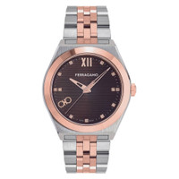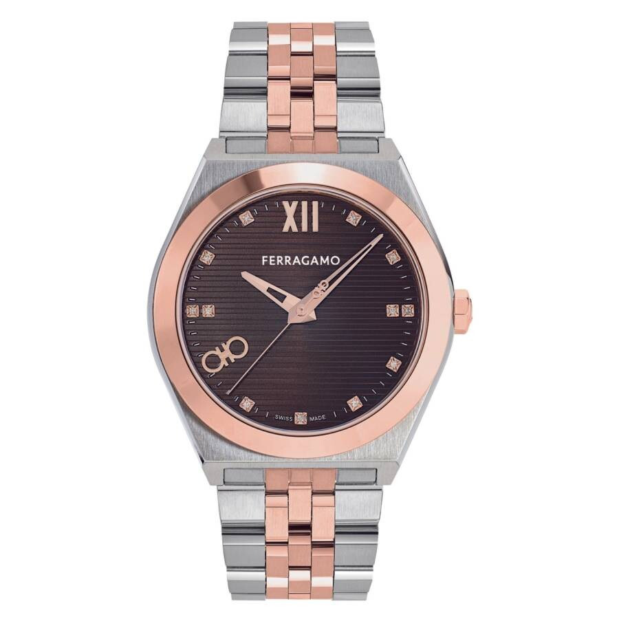 Silver-tone stainless steel case with a two-tone (silver-tone and rose gold-tone) stainless steel bracelet. Fixed rose gold-tone stainless steel bezel. Brown dial with rose gold-tone hands and diamond-Roman numeral hour markers. Minute markers around the outer rim. Dial Type: Analog. Gancini logo detail at 8 0' clock. Quartz movement. Scratch resistant sapphire crystal. Pull / push crown. Solid case back. Round case shape, case size: 40 mm. Deployment with push button release clasp. Water resistant at 50 meters / 165 feet. Functions: hour, minute, second. Vega Series. Dress watch style. Watch label: Swiss Made. Ferragamo Vega Quartz Brown Dial Two-Tone Men's Watch SFKI01224. GENERAL Box Type: Original Box CASE Case Material: Stainless Steel Case Shape: Round Case Back: Solid BAND Band Material: Stainless Steel Band Type: Bracelet Band Color: Two-tone (Silver-tone and Rose Gold-tone) Clasp: Deployment with Push Button Release DIAL Dial Color: Brown Type: Analog Crystal: Scratch Resistant Sapphire Hands: Rose Gold-tone Dial Markers: Diamond-Roman Numeral Second Markers: Minute Markers around the outer rim Bezel: Fixed Bezel Color: Rose Gold-tone Bezel Material: Stainless Steel Crown: Pull / Push INFORMATION Brand: Ferragamo Series: Vega Collection Name: Vega Gender: Mens Model: SFKI01224 Watch Label: Swiss Made Movement: Quartz FEATURES Water Resistance: 50 meters / 165 feet Calendar: Gancini logo detail at 8 0' clock Functions: Hour, Minute, Second Watch Features: Analog, Gold, Stainless Steel, Diamond ADDITIONAL INFO Watch Style: Dress Jomashop Sku: Z-VUGRS Department: Watches