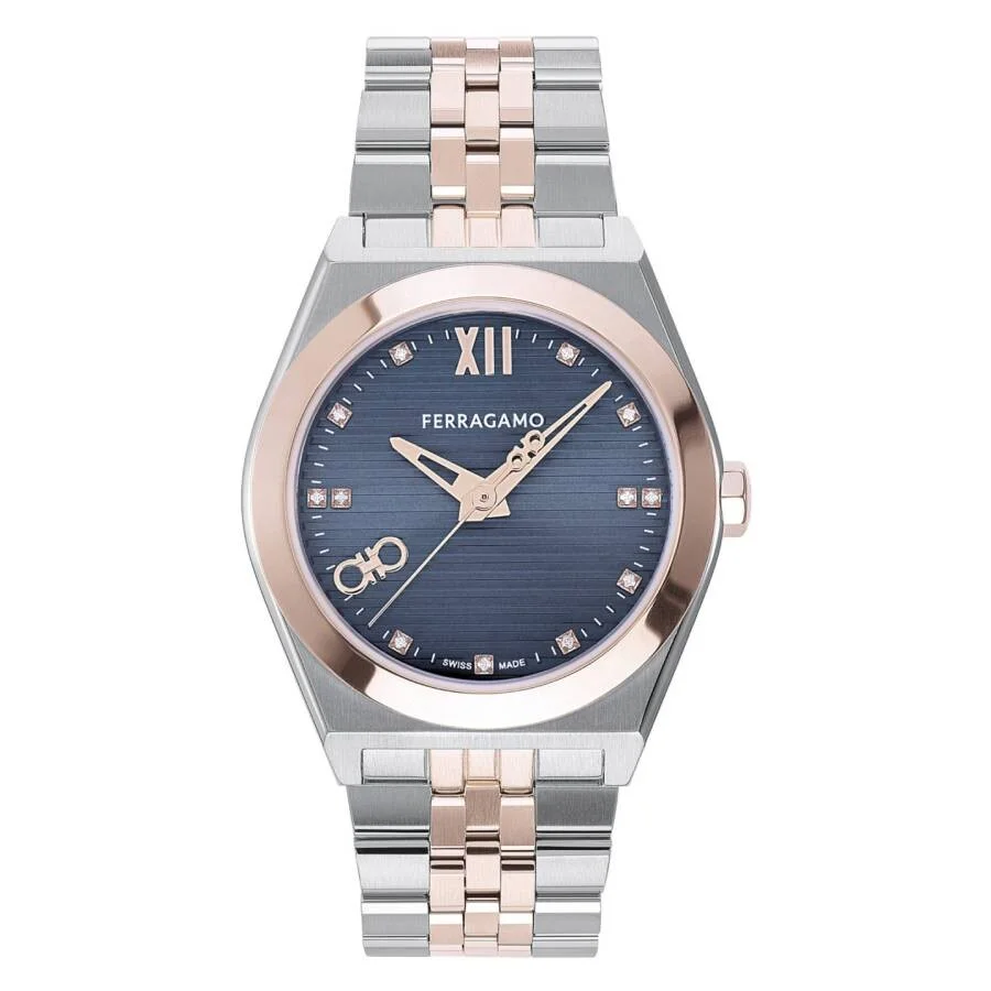 Silver-tone stainless steel case with a two-tone (silver-tone and rose gold-tone) stainless steel bracelet. Fixed rose gold-tone stainless steel bezel. Blue guilloche dial with rose gold-tone hands and diamond hour markers. Gancini logo detail at 8 o'clock position. Minute markers around the outer rim. Dial Type: Analog. Quartz movement. Scratch resistant sapphire crystal. Pull / push crown. Solid case back. Round case shape, case size: 40 mm. Deployment with push button release clasp. Water resistant at 50 meters / 165 feet. Functions: hour, minute, second. Vega Series. Dress watch style. Watch label: Swiss Made. Ferragamo Vega Quartz Diamond Blue Dial Men's Watch SFKI00824. GENERAL Box Type: Original Box CASE Case Material: Stainless Steel Case Shape: Round Case Back: Solid BAND Band Material: Stainless Steel Band Type: Bracelet Band Color: Two-tone (Silver-tone and Rose Gold-tone) Clasp: Deployment with Push Button Release DIAL Dial Color: Blue Guilloche Type: Analog Crystal: Scratch Resistant Sapphire Hands: Rose Gold-tone Dial Markers: Diamond Second Markers: Gancini logo detail at 8 o'clock position. Minute Markers around the outer rim Bezel: Fixed Bezel Color: Rose Gold-tone Bezel Material: Stainless Steel Crown: Pull / Push INFORMATION Brand: Ferragamo Series: Vega Collection Name: Vega Gender: Mens Model: SFKI00824 Watch Label: Swiss Made Movement: Quartz FEATURES Water Resistance: 50 meters / 165 feet Functions: Hour, Minute, Second Watch Features: Analog, Gold, Stainless Steel, Diamond ADDITIONAL INFO Watch Style: Dress Warranty: 2 Year Jomashop Warranty Jomashop Sku: FR-SFKI00824 Department: Watches