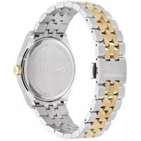 Silver-tone stainless steel case with a two-tone (silver-tone and gold-tone) stainless steel bracelet. Fixed gold-tone stainless steel bezel. Silver dial with gold-tone hands and diamond-Roman numeral hour markers. Minute markers around the outer rim. Dial Type: Analog. Gancini logo detail at 8 0' clock. Quartz movement. Scratch resistant sapphire crystal. Pull / push crown. Solid case back. Round case shape, case size: 40 mm. Deployment with push button release clasp. Water resistant at 50 meters / 165 feet. Functions: hour, minute, second. Vega Series. Dress watch style. Watch label: Swiss Made. Ferragamo Vega Quartz Silver Dial Two-Tone Men's Watch SFKI01324. GENERAL Box Type: Original Box CASE Case Material: Stainless Steel Case Shape: Round Case Back: Solid BAND Band Material: Stainless Steel Band Type: Bracelet Band Color: Two-tone (Silver-tone and Gold-tone) Clasp: Deployment with Push Button Release DIAL Dial Color: Silver Type: Analog Crystal: Scratch Resistant Sapphire Hands: Gold-tone Dial Markers: Diamond-Roman Numeral Second Markers: Minute Markers around the outer rim Bezel: Fixed Bezel Color: Gold-tone Bezel Material: Stainless Steel Crown: Pull / Push INFORMATION Brand: Ferragamo Series: Vega Collection Name: Vega Gender: Mens Model: SFKI01324 Watch Label: Swiss Made Movement: Quartz FEATURES Water Resistance: 50 meters / 165 feet Calendar: Gancini logo detail at 8 0' clock Functions: Hour, Minute, Second Watch Features: Analog, Gold, Stainless Steel, Diamond ADDITIONAL INFO Watch Style: Dress Jomashop Sku: Z-475CP Department: Watches
