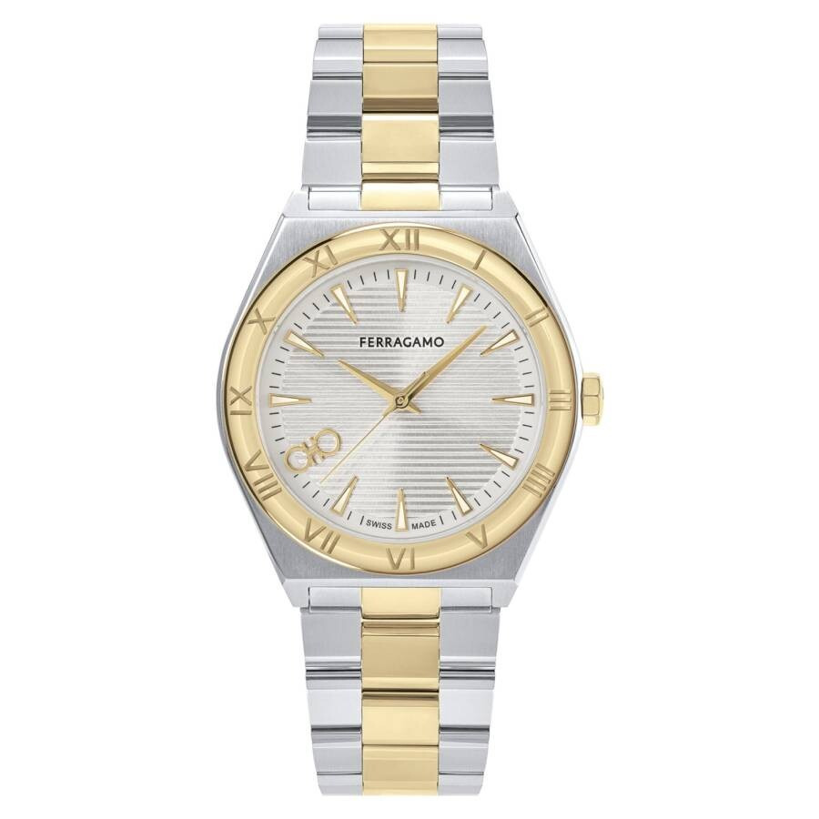 Silver-tone stainless steel case with a two-tone (silver-tone and gold-tone) stainless steel bracelet. Fixed gold-tone stainless steel bezel. Silver dial with gold-tone hands and index hour markers. Double gancini logo at the 8 o'clock position. Minute markers around the outer rim. Dial Type: Analog. Quartz movement. Scratch resistant sapphire crystal. Pull / push crown. Solid case back. Round case shape, case size: 40 mm. Deployment with push button release clasp. Water resistant at 50 meters / 165 feet. Functions: hour, minute, second. Vega Upper East Series. Dress watch style. Watch label: Swiss Made. Ferragamo Vega Upper East Quartz Silver Dial Men's Watch SFKV00223. GENERAL Box Type: Original Box CASE Case Material: Stainless Steel Case Shape: Round Case Back: Solid BAND Band Material: Stainless Steel Band Type: Bracelet Band Color: Two-tone (Silver-tone and Gold-tone) Clasp: Deployment with Push Button Release DIAL Dial Color: Silver Type: Analog Crystal: Scratch Resistant Sapphire Hands: Gold-tone Dial Markers: Index Second Markers: Double Gancini logo at the 8 o'clock position. Minute Markers around the outer rim Bezel: Fixed Bezel Color: Gold-tone Bezel Material: Stainless Steel Crown: Pull / Push INFORMATION Brand: Ferragamo Series: Vega Upper East Collection Name: Vega Upper East Gender: Mens Model: SFKV00223 Watch Label: Swiss Made Movement: Quartz FEATURES Water Resistance: 50 meters / 165 feet Functions: Hour, Minute, Second Watch Features: Stainless Steel, Gold, Analog ADDITIONAL INFO Watch Style: Dress Jomashop Sku: Z-3NM8E Department: Watches