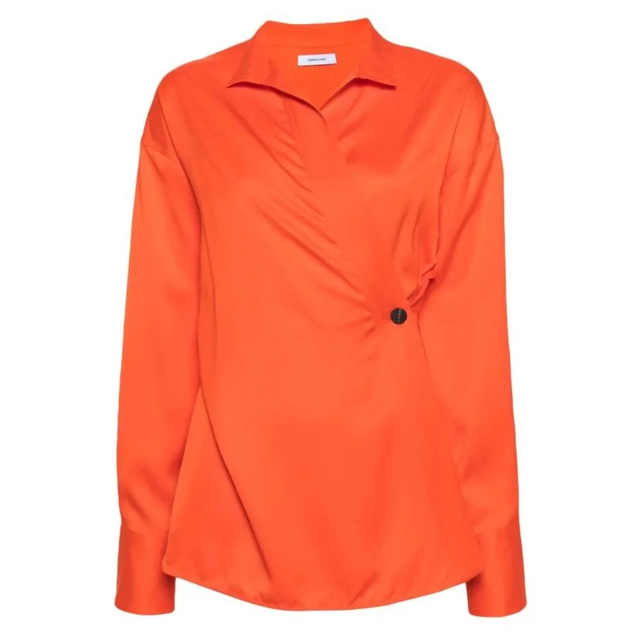 Ferragamo Ladies Tops. Fashion category: Shirts & Blouses. SKU: 13C968 770456. Color: Red. Ferragamo Wrap Design Long-Sleeve Blouse. This blouse features a modern Mandarin-inspired design with a wrap front and asymmetric silhouette. It showcases a spread collar, drop shoulders, and long sleeves with high, buttoned cuffs for a refined finish. The fitted waistline accentuates the shape, while the high-low hem and side button fastening. 96% Viscose, 4% Elastane. Made in Italy. GENERAL Color: Red INFORMATION Brand: Ferragamo Gender: Womens Model: 13C968 770456 DETAILS Category: Tops Apparel Type: Shirts & Blouses Material: Elastane, Viscose ADDITIONAL INFO Jomashop Sku: -13C968770456 Department: Clothing