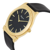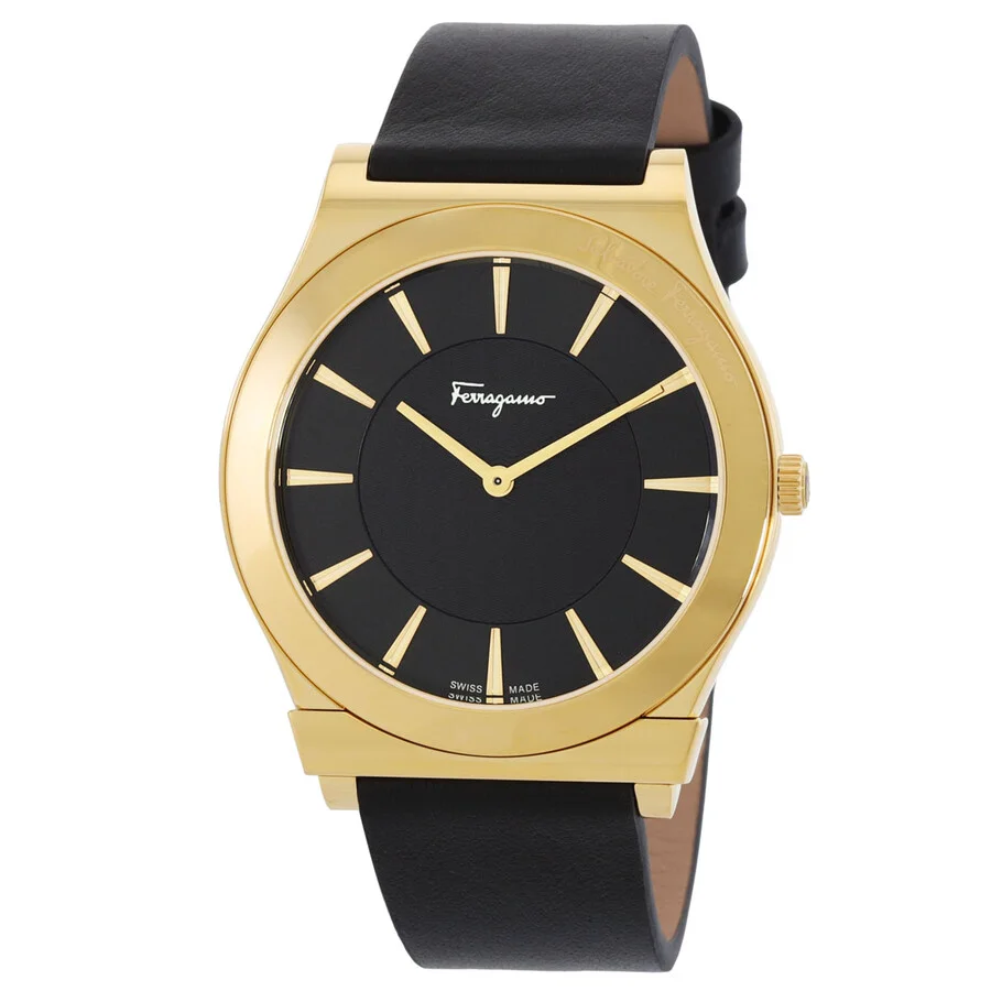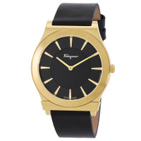 Yellow gold-tone stainless steel case with a black leather strap. Fixed yellow gold-tone stainless steel bezel. Black dial with yellow gold-tone hands and index hour markers. Dial Type: Analog. Quartz movement. Scratch resistant sapphire crystal. Round case shape, case size: 41 mm, case thickness: 6.9 mm. Water resistant at 30 meters / 100 feet. Functions: hour, minute. Ferragamo 1898 Slim Series. Luxury watch style. Watch label: Swiss Made. Salvatore Ferragamo Ferragamo 1898 Slim Quartz Black Dial Men's Watch SFPE00219. CASE Case Size: 41 Case Thickness: 6.9 mm Case Material: Stainless Steel Case Shape: Round BAND Band Material: Leather Band Type: Strap Band Color: Black DIAL Dial Color: Black Type: Analog Crystal: Scratch Resistant Sapphire Hands: Yellow Gold-tone Dial Markers: Index Bezel: Fixed Bezel Color: Yellow Gold-tone Bezel Material: Stainless Steel INFORMATION Brand: Salvatore Ferragamo Series: Ferragamo 1898 Slim Collection Name: Ferragamo 1898 Slim Gender: Mens Model: SFPE00219 Watch Label: Swiss Made Movement: Quartz FEATURES Water Resistance: 30 meters / 100 feet Functions: Hour, Minute Watch Features: Stainless Steel, Leather, Gold, Analog ADDITIONAL INFO Watch Style: Luxury Warranty: With Manufacturers Guarantee UPC Code: 191966105080 Jomashop Sku: Y-A2UBF Department: Watches Category: Watches