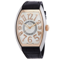 Silver-tone stainless steel case with a black alligator band. Fixed rose gold-tone 18kt rose gold bezel. Silver-tone dial with rose gold-tone hands and Arabic numeral hour markers. Dial Type: Analog. Luminescent hands. Automatic movement. Scratch resistant sapphire crystal. Tonneau case shape, case size: 40 mm. Functions: hour, minute, second. Additional Info: original box, international warranty card, manual (complete accessories). Cintree Curvex Series. Luxury watch style. Watch label: Swiss Made. Franck Muller Cintree Curvex Automatic Silver Dial Men's Watch CX40SCAT(AC5NAC5N). INFORMATION Brand: Franck Muller Series: Cintree Curvex Collection Name: Cintree Curvex Gender: Mens Model: CX40SCAT(AC5NAC5N) Watch Label: Swiss Made Movement: Automatic CASE Case Size: 40 mm Case Material: Stainless Steel Case Shape: Tonneau BAND Band Material: Alligator Band Type: Strap Band Color: Black DIAL Dial Color: Silver-tone Type: Analog Crystal: Scratch Resistant Sapphire Hands: Rose Gold-tone Dial Markers: Arabic Numeral Luminiscence: Hands Bezel: Fixed Bezel Color: Rose Gold-tone Bezel Material: 18kt Rose Gold FEATURES Functions: Hour, Minute, Second Watch Features: Stainless Steel, Gold, Analog, Alligator Leather ADDITIONAL INFO Watch Style: Luxury Warranty: 2 Year Jomashop Warranty Additional Info: Original Box, International Warranty Card, Manual (Complete Accessories) Jomashop Sku: FMCX40SCATAC5NAC5N Department: Watches Category: Watches