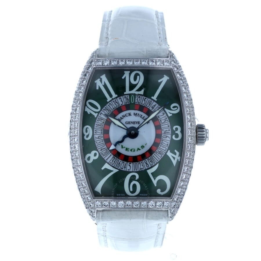 18k white gold case with a black alligator leather strap. Fixed bezel set with diamonds. Black/roulette motif dial with luminous hands and Arabic numeral hour markers. Roulette scale around the inner ring. Dial Type: Analog. Scratch resistant sapphire crystal. Case diameter: 47 mm x 34 mm. Tonneau case shape. Tang clasp. Functions: hour, minute. Additional Info: also features a push-button coaxial on the crown which operates a central needle for a quick game of roulette! Luxury watch style. Watch label: Swiss Made. Item Variations: 6850 VEGASD, 6850.VEGASD, 6850VEGASD. Franck Muller Tonneau Curvex Vegas 18K White Gold Men's Watch 6850-VEGASD. GENERAL Box Type: Original Box CASE Case Material: 18kt White Gold Case Shape: Tonneau Case Back: Solid BAND Band Material: Alligator Leather Band Type: Strap Band Color: White Clasp: Tang DIAL Dial Color: Black/Roulette Motif Type: Analog Crystal: Scratch Resistant Sapphire Hands: Luminous Dial Markers: Arabic Numeral Second Markers: Roulette scale around the inner ring Luminiscence: Hands Bezel: Fixed Bezel Color: Gold-tone Bezel Material: Diamond Set 18kt White Gold INFORMATION Brand: Franck Muller Series: Tonneau Curvex Vegas Collection Name: Tonneau Curvex Vegas Gender: Mens Model: 6850-VEGASD Watch Label: Swiss Made Movement: Automatic FEATURES Functions: Hour, Minute Watch Features: Alligator Leather, Analog, Gold, Leather, Diamond ADDITIONAL INFO Watch Style: Luxury Warranty: 2 Year Jomashop Warranty Additional Info: Also features a push-button coaxial on the crown which operates a central needle for a game of roulette! Jomashop Sku: FM-6850-VEGASD Item Variation: 6850 VEGASD, 6850.VEGASD, 6850VEGASD Department: Watches Category: Watches