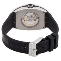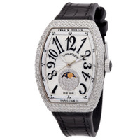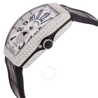 Silver-tone stainless steel case with a leather (alligator )and rubber strap. Fixed bezel with diamond set. White dial with rainbow Arabic numeral hour markers. Dial Type: Analog. Luminescent hands. One subdial displaying: moonphase. Automatic movement with a 40-hour power reserve. Scratch resistant sapphire crystal. Transparent case back. Tonneau case shape, case size: 32 x 42.3 mm. Tang clasp. Functions: hour, minute, second. Vanguard Lady Series. Luxury watch style. Watch label: Swiss Made. Item Variations: V 32 SC AT FO L D CD 1P AC NR. Franck Muller Vanguard Lady Automatic Diamond White Dial Watch V 32 SC AT FO L D CD 1P AC NR. CASE Case Size: 32 Case Material: Stainless Steel Case Shape: Tonneau Case Back: Transparent BAND Band Material: Leather (Alligator )and Rubber Band Type: Strap Band Color: Black Clasp: Tang DIAL Dial Color: White Type: Analog Crystal: Scratch Resistant Sapphire Dial Markers: Rainbow Arabic Numeral Sub Dials: One - Moonphase Luminiscence: Hands Bezel: Fixed Bezel Material: Diamond Set INFORMATION Brand: Franck Muller Series: Vanguard Lady Collection Name: Vanguard Lady Gender: Womens Model: V 32 SC AT FO L D CD 1P AC NR Watch Label: Swiss Made Movement: Automatic Power Reserve: 40 hours FEATURES Water Resistance: 30 meters / 100 feet Functions: Hour, Minute, Second Watch Features: Alligator Leather, Analog, Leather, Rubber, Stainless Steel, Diamond ADDITIONAL INFO Watch Style: Luxury Warranty: 2 Year Jomashop Warranty Jomashop Sku: Z-LEPPU Item Variation: V 32 SC AT FO L D CD 1P AC NR Department: Watches