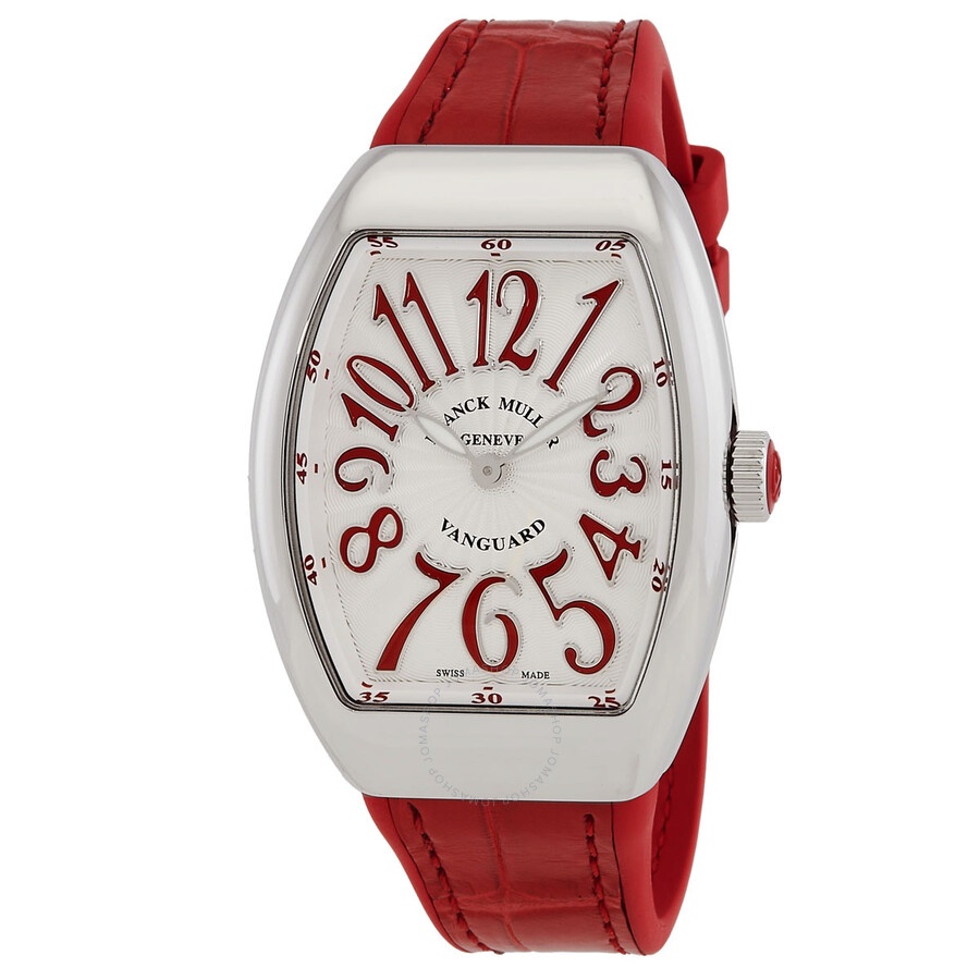 Silver-tone stainless steel case with a red rubber strap. Fixed silver-tone stainless steel bezel. Silver-tone dial with silver-tone hands and Arabic numeral hour markers. Dial Type: Analog. Luminescent hands. Franck Muller Calibre MVT FM 1321-QZ quartz movement. Scratch resistant sapphire crystal. Pull / push crown. Solid case back. Tonneau case shape, case size: 35 mm, case thickness: 10.4 mm. Band width: 22 mm, band length: 7 inches. Tang clasp. Water resistant at 30 meters / 100 feet. Functions: hour, minute. Additional Info: quartz frequency set at 32,768 alternations per hour. Vanguard Series. Luxury watch style. Watch label: Swiss Made. Franck Muller Vanguard Quartz Silver Dial Ladies Watch 35QZREDSILRED. CASE Case Size: 35 Case Thickness: 10.4 mm Case Material: Stainless Steel Case Shape: Tonneau Case Back: Solid BAND Band Material: Rubber Band Type: Strap Band Color: Red Band Length: 7 inches Band Width: 22 mm Clasp: Tang DIAL Dial Color: Silver-tone Type: Analog Crystal: Scratch Resistant Sapphire Hands: Silver-tone Dial Markers: Arabic Numeral Luminiscence: Hands Bezel: Fixed Bezel Color: Silver-tone Bezel Material: Stainless Steel Crown: Pull / Push INFORMATION Brand: Franck Muller Series: Vanguard Collection Name: Vanguard Gender: Womens Model: 35QZREDSILRED Watch Label: Swiss Made Movement: Quartz Engine: Franck Muller Calibre MVT FM 1321-QZ FEATURES Water Resistance: 30 meters / 100 feet Functions: Hour, Minute Watch Features: Analog, Rubber, Stainless Steel ADDITIONAL INFO Watch Style: Luxury Warranty: 2 Year Jomashop Warranty Additional Info: Quartz frequency set at 32,768 alternations per hour Jomashop Sku: FM35QZREDSILRED Department: Watches Category: Watches