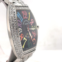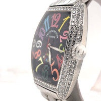 Silver-tone stainless steel case and bracelet. Fixed silver-tone bezel with diamond set stainless steel. Black dial with silver-tone hands and Arabic numeral hour markers. Dial Type: Analog. Luminescent hands. Automatic movement. Scratch resistant sapphire crystal. Pull / push crown. Solid case back. Tonneau case shape, case size: 32 mm, case thickness: 14 mm. Band width: 18 mm. Hidden clasp. Water resistant at 30 meters / 100 feet. Functions: hour, minute, second. Cintree Curvex Color Dreams Series. Luxury watch style. Watch label: Swiss Made. Pre-owned Franck Muller Cintree Curvex Color Dreams Automatic Diamond Black Dial Ladies Watch 5850 SC D. GENERAL Collection Name: Cintrée Curvex Color Dreams INFORMATION Brand: Franck Muller Series: Cintrée Curvex Color Dreams Model: 5850 SC D Gender: Womens Watch Label: Swiss Made Movement: Automatic CONDITION INFORMATION Box: No Preowned Item Condition: Excellent Papers: No CASE Case Size: 32 mm Case Thickness: 14 mm Case Material: Stainless Steel Case Shape: Tonneau Case Back: Solid DIAL Type: Analog Dial Color: Black Crystal: Scratch Resistant Sapphire Hands: Silver-tone Dial Markers: Arabic Numeral Luminiscence: Hands Bezel: Fixed Bezel Color: Silver-tone Bezel Material: Diamond Set Stainless Steel Crown: Pull / Push BAND Band Type: Bracelet Band Material: Stainless Steel Band Color: Silver-tone Band Width: 18 mm Clasp: Hidden FEATURES Water Resistance: 30 meters / 100 feet Functions: Hour, Minute, Second Watch Features: Diamond, Stainless Steel, Analog ADDITIONAL INFO Watch Style: Luxury Warranty: 1 Year Jomashop Warranty Jomashop Sku: PRE-P-FM61044 Department: Watches Category: Watches