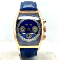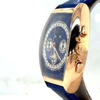 Rose gold-tone 18kt rose gold case with a blue leather strap. Fixed rose gold-tone 18kt rose gold bezel. Blue dial with rose gold-tone hands and Arabic numeral hour markers. Minute markers around the outer rim. Dial Type: Analog. Automatic movement. Scratch resistant sapphire crystal. Pull / push crown. Solid case back. Tonneau case shape, case size: 34 mm, case thickness: 14 mm. Band width: 20 mm. Buckle clasp. Water resistant at 30 meters / 100 feet. Functions: calendar, day, date, month, chronograph, chronometer, hour, minute, second, water resistant. Master Calendar Magnum Series. Luxury watch style. Watch label: Swiss Made. Pre-owned Franck Muller Master Calendar Magnum Chronograph Blue Dial Men's Watch 6850 CC MC. GENERAL Collection Name: Master Calendar Magnum INFORMATION Brand: Franck Muller Series: Master Calendar Magnum Model: 6850 CC MC Gender: Mens Watch Label: Swiss Made Movement: Automatic CONDITION INFORMATION Box: Yes Preowned Item Condition: Excellent Papers: Yes CASE Case Size: 34 Case Thickness: 14 mm Case Material: 18kt Rose Gold Case Shape: Tonneau Case Back: Solid DIAL Type: Analog Dial Color: Blue Crystal: Scratch Resistant Sapphire Hands: Rose Gold-tone Second Markers: Minute Markers around the outer rim Dial Markers: Arabic Numeral Bezel: Fixed Bezel Color: Rose Gold-tone Bezel Material: 18kt Rose Gold Crown: Pull / Push BAND Band Type: Strap Band Material: Leather Band Color: Blue Band Width: 20 mm Clasp: Buckle FEATURES Water Resistance: 30 meters / 100 feet Functions: Calendar, Day, Date, Month, Chronograph, Chronometer, Hour, Minute, Second, Water resistant Watch Features: Month, Analog, Chronometer, Gold, Leather, Chronograph ADDITIONAL INFO Watch Style: Luxury Warranty: 1 Year Jomashop Warranty Jomashop Sku: PRE-P-FM87159 Department: Watches