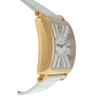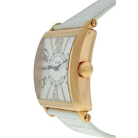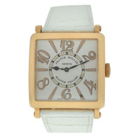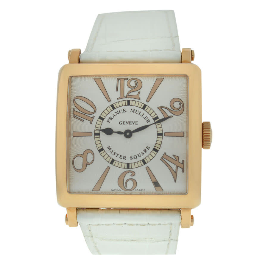 Rose gold-tone 18kt rose gold case with a white genuine leather strap. Fixed rose gold-tone 18kt rose gold bezel. White dial with black hands and Arabic numeral hour markers. Minute scale around the inner rim. Dial Type: Analog. Quartz movement. Scratch resistant sapphire crystal. Solid case back. Square case shape, case size: 36 mm, case thickness: 11 mm. Functions: hour, minute. Master Square Series. Luxury watch style. Watch label: Swiss Made. Pre-owned Franck Muller Master Square Quartz White Dial Men's Watch 6002 H QZ REL 6/6. GENERAL Collection Name: Master Square INFORMATION Brand: Franck Muller Series: Master Square Model: 6002 H QZ REL 6/6 Gender: Mens Watch Label: Swiss Made Movement: Quartz CONDITION INFORMATION Box: Yes Preowned Item Condition: Unworn / Like New Papers: Yes Comments: Franck Muller Master Square 6002 H QZ REL 6/6 18K Rose Gold Quartz 36MM Watch. The new store display model without any scratches. The watch fit's men's wrist up to 7.5 inches. CASE Case Size: 36 mm Case Thickness: 11 mm Case Material: 18kt Rose Gold Case Shape: Square Case Back: Solid DIAL Type: Analog Dial Color: White Crystal: Scratch Resistant Sapphire Hands: Black Second Markers: Minute Scale around the inner rim Dial Markers: Arabic Numeral Bezel: Fixed Bezel Color: Rose Gold-tone Bezel Material: 18kt Rose Gold BAND Band Type: Strap Band Material: Genuine Leather Band Color: White FEATURES Functions: Hour, Minute Watch Features: Leather, Gold, Analog ADDITIONAL INFO Watch Style: Luxury Warranty: 1 Year Jomashop Warranty Jomashop Sku: PRE-P-FM53091 Department: Watches Category: Watches