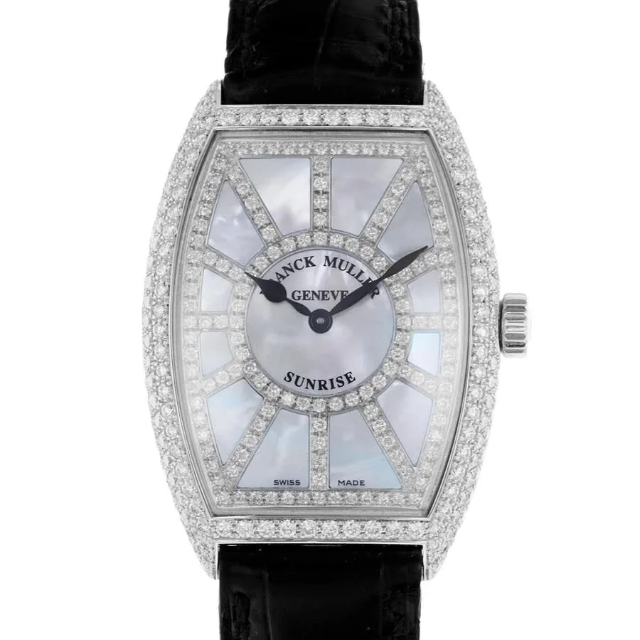 18kt white gold case with a black leather strap. Fixed bezel with diamond set 18kt white gold. Mother of pearl dial with black hands and diamond hour markers. Dial Type: Analog. Quartz movement. Scratch resistant sapphire crystal. Screw down crown. Tonneau case shape, case size: 32 mm. Buckle clasp. Functions: hour, minute. Sunrise Series. Luxury watch style. Watch label: Swiss Made. Pre-owned Franck Muller Sunrise Quartz Diamond Men's Watch 5852 QZ SNR D CD. GENERAL Year: 2014 Comments: This Franck Muller Sunrise, reference number 5852 QZ SNR D CD, has a manufacturer year of 2014. Box not included, Papers Included . This watch has a 32mm White Gold Case with White gold bezel, Mother of pearl Index numerals dial and Leather bracelet with Buckle. The Quartz movement has Time Only function. The wrist measures 7.5 inches or 19.05 centimeters. The condition is Very Good The watch listed is in stock and the pictures shown are of the actual watch for sale. All of our watches have bee Preowned Item Condition: Very Good CASE Case Material: 18kt White Gold Case Shape: Tonneau BAND Band Material: Leather Band Type: Strap Band Color: Black Clasp: Buckle DIAL Dial Color: Mother of Pearl Type: Analog Crystal: Scratch Resistant Sapphire Hands: Black Dial Markers: Diamond Bezel: Fixed Bezel Material: Diamond Set 18kt White Gold Crown: Screw Down INFORMATION Brand: Franck Muller Series: Sunrise Collection Name: Sunrise Gender: Mens Model: 5852 QZ SNR D CD Watch Label: Swiss Made Movement: Quartz FEATURES Functions: Hour, Minute Watch Features: Diamond, Leather, Gold, Analog ADDITIONAL INFO Watch Style: Luxury Warranty: 1 Year Jomashop Warranty Jomashop Sku: PRE-P-FM101301 Department: Watches Category: Watches