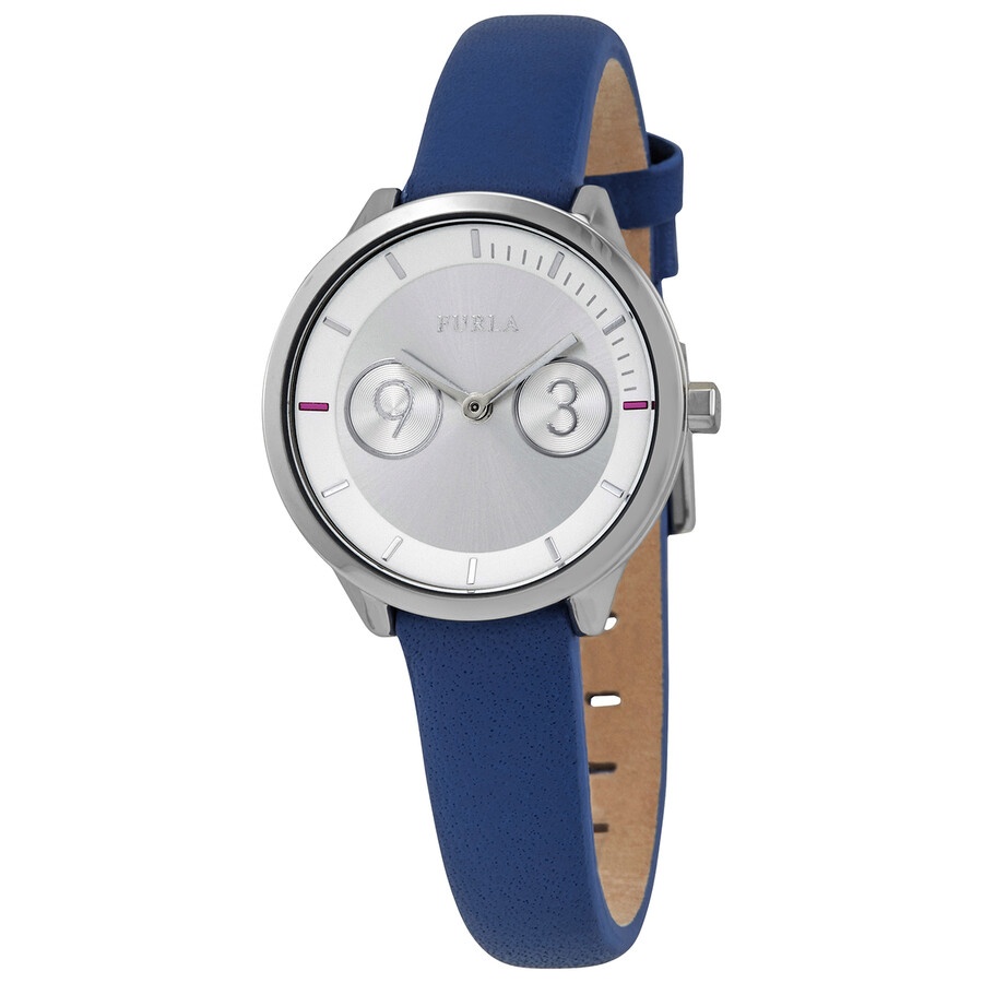 Stainless steel case with a blue (calfskin) leather strap. Fixed stainless steel bezel. Silver dial with silver-tone hands and index hour markers. Over-sized Arabic numerals appear at the 3 and 9 o'clock position. Dial Type: Analog. Quartz movement. Scratch resistant mineral crystal. Pull / push crown. Solid case back. Round case shape. Case size: 31 mm. Case thickness: 8 mm. Band width: 13 mm. Band length: 7.5 inches. Tang clasp. Water resistant at 30 meters / 100 feet. Functions: hour, minute. Metropolis Series. Casual watch style. Furla Metropolis Silver Dial Ladies Watch R4251102508. INFORMATION Brand: Furla Series: Metropolis Collection Name: Metropolis Gender: Womens Model: R4251102508 Movement: Quartz CASE Case Size: 31 mm Case Thickness: 8 mm Case Material: Stainless Steel Case Shape: Round Case Back: Solid BAND Band Material: (Calfskin) Leather Band Type: Strap Band Color: Blue Band Length: 7.5 inches Band Width: 13 mm Clasp: Tang DIAL Dial Color: Silver Type: Analog Crystal: Scratch Resistant Mineral Hands: Silver-tone Dial Markers: Index Second Markers: Over-sized Arabic Numerals appear at the 3 and 9 o'clock position Bezel: Fixed Bezel Color: Silver-tone Bezel Material: Stainless Steel Crown: Pull / Push FEATURES Water Resistance: 30 meters / 100 feet Functions: Hour, Minute Watch Features: Stainless Steel, Leather, Analog ADDITIONAL INFO Watch Style: Casual Warranty: 2 Year Jomashop Warranty UPC Code: 8033288733898 Jomashop Sku: FU-R4251102508 Department: Watches Category: Watches