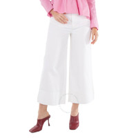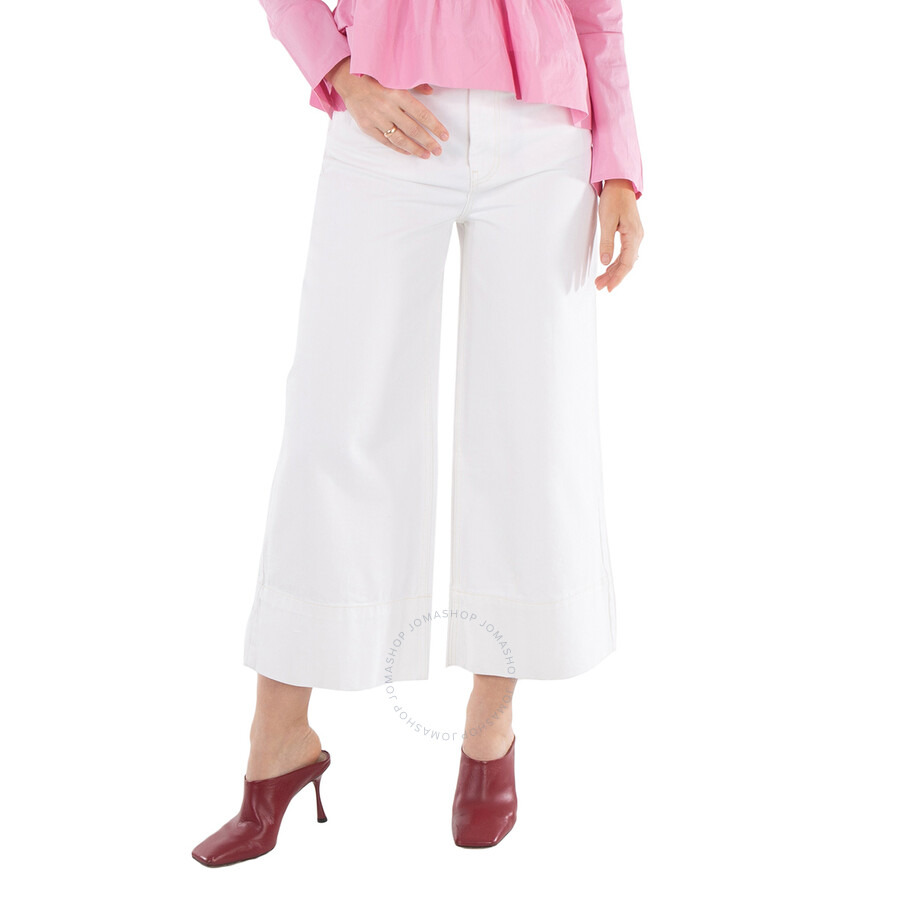 Ganni Ladies Bottoms. Fashion category: Jeans & Denim. SKU: J1266-151. Color: Bright White. Ganni Bright White Denim Cropped High-Rise Jeans. Cafted from organic cotton, featuring a high-rise waist and wide legs, they offer a relaxed, cropped fit. The design includes a classic 5-pocket style with a zip and button closure, and is finished with the Ganni logo on the back pocket. 100% Organic Cotton. GENERAL Color: Bright White INFORMATION Brand: Ganni Gender: Womens Model: J1266-151 DETAILS Category: Bottoms Apparel Type: Jeans & Denim Material: Organic Cotton ADDITIONAL INFO Jomashop Sku: -J1266151 Department: Apparel
