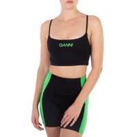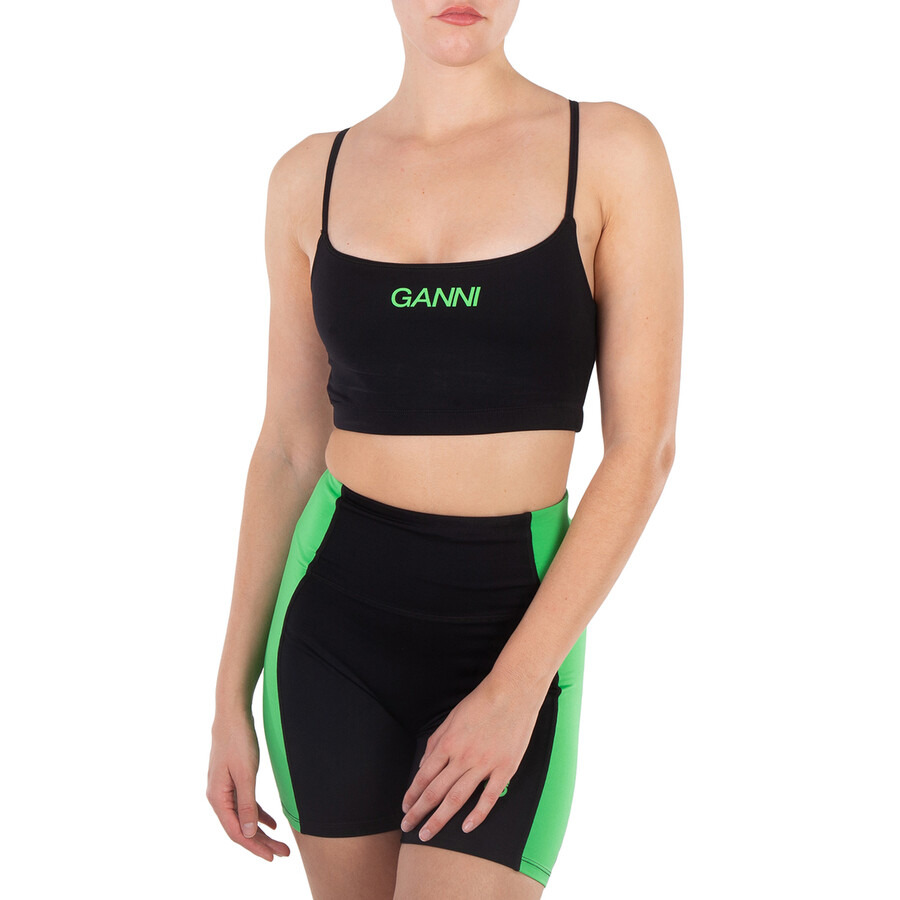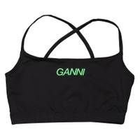Ganni Ladies Tops. Fashion category: Active & Lounge. SKU: T3393-099. Color: Black. Ganni Ladies Black Logo-Print Cropped Top. his cropped top is made from a recycled polyester blend and features a logo print on the front. It has a square neck, criss-cross straps at the back, and a straight hemline. GENERAL Color: Black INFORMATION Brand: Ganni Gender: Womens Model: T3393-099 DETAILS Category: Tops Apparel Type: Active & Lounge ADDITIONAL INFO Jomashop Sku: -T3393099 Department: Apparel