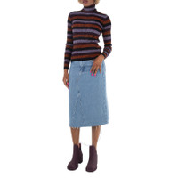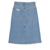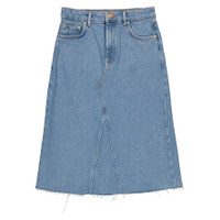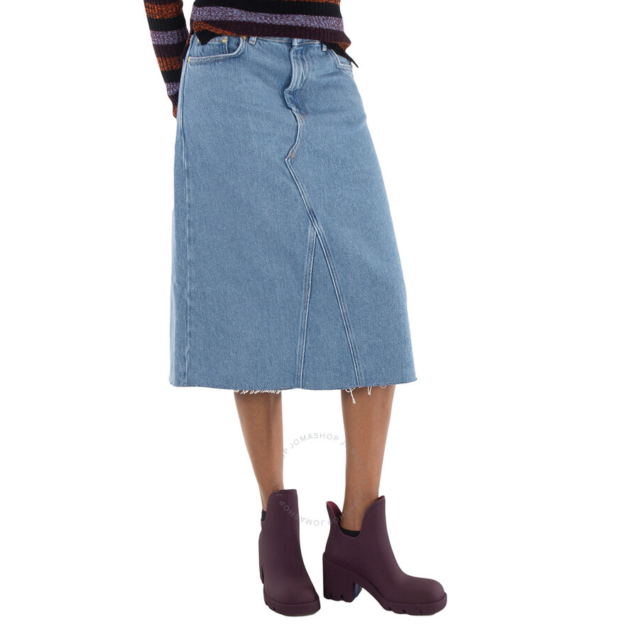 Ganni Ladies Bottoms. Fashion category: Skirts. SKU: J1289-564. Color: Light Blue Stone. Ganni Ladies Light Blue Stone Denim Organic Cotton Midi Skirt. his skirt showcases a timeless five-pocket design and frayed hems, blending nostalgic charm with modern style. Crafted from organic cotton, it underscores GANNI's dedication to sustainability. Made from 100% Organic Cotton, it features a 5-pocket setup, belt loops, zip fly with button closure, raw hem, and a woven brand patch. GENERAL Color: Light Blue Stone INFORMATION Brand: Ganni Gender: Womens Model: J1289-564 DETAILS Category: Bottoms Apparel Type: Skirts ADDITIONAL INFO Jomashop Sku: -J1289564 Department: Apparel