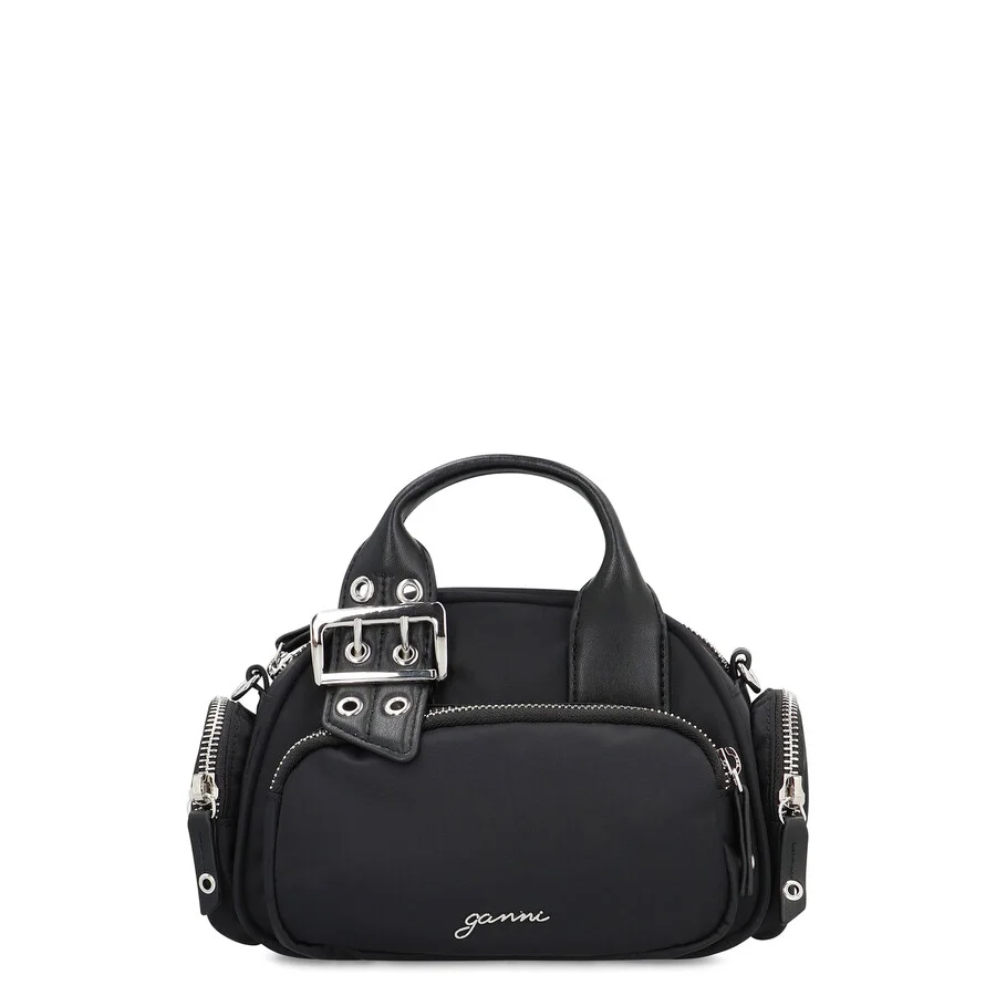 Ganni Ladies Tote. SKU: A67385920_099. Color: Black. Ganni Mini Polochon Handbag. Made from recycled materialsnylon item with leather detailstwo leather handlestop zippered closurefront zip pockettwo side zip pocketsone internal flat pocketadjustable and removable leather shoulder strapsilver-tone metal hardwarenylon liningwidth: 19 cmheight: 16,5 cmdepth: 8 cmstrap: 100 cm100% nylon, 100% polyester. Composition: 100% % Nylon, 100% % Polyester. GENERAL Color: Black INFORMATION Brand: Ganni Gender: Womens Model: A67385920_099 ADDITIONAL INFO UPC Code: 5714667771832 Jomashop Sku: Z-D4NSK Department: Bags Category: Tote Bags