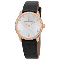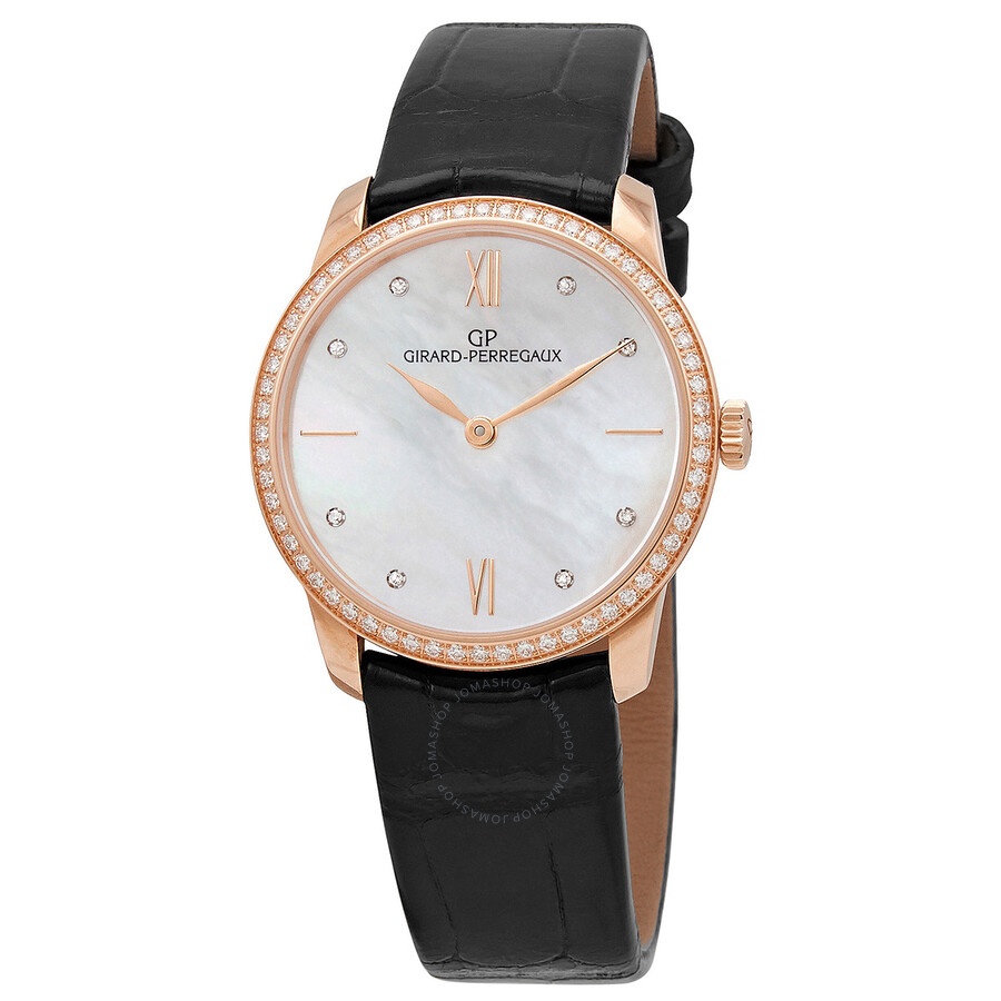 18kt rose gold case with a black (alligator) leather strap. Fixed 18kt rose gold bezel set with 60 diamonds. Mother of pearl dial with rose gold-tone hands and diamond hour markers. Index markers appears at the 3 and 9 o'clock positions. Roman numerals mark the 6 and 12 o'clock positions. Dial Type: Analog. Girard Perregaux calibre GP03200-0005 automatic movement, containing 26 Jewels, composed of 185 parts, bitting at 28800 vph, and has a power reserve of approximately 42 hours. Scratch resistant sapphire crystal. Pull / push crown. Transparent case back. Round case shape. Case size: 30 mm. Case thickness: 8.9 mm. Tang clasp. Water resistant at 30 meters / 100 feet. Functions: hour, minute. Additional Info: case set with 60 diamonds (0.55 ct.). Girard Perregaux 1966 Series. Luxury watch style. Watch label: Swiss Made. Item Variations: 49528 D52A771 CK6A, 49528.D52A771.CK6A, 49528D52A771CK6A. Girard Perregaux 1966 Lady Automatic Dimond Watch 49528-D52A771-CK6A. INFORMATION Brand: Girard Perregaux Series: Girard Perregaux 1966 Collection Name: Girard Perregaux 1966 Gender: Womens Model: 49528-D52A771-CK6A Watch Label: Swiss Made Movement: Automatic Engine: Girard Perregaux Calibre GP03200-0005 Power Reserve: 42 hours CASE Case Size: 30 mm Case Thickness: 8.9 mm Case Material: 18kt Rose Gold Case Shape: Round Case Back: Transparent BAND Band Material: (Alligator) Leather Band Type: Strap Band Color: Black Clasp: Tang DIAL Dial Color: Mother of Pearl Type: Analog Crystal: Scratch Resistant Sapphire Hands: Rose Gold-tone Dial Markers: Diamond Second Markers: Index Markers appears at the 3 and 9 o'clock positions. Roman Numerals mark the 6 and 12 o'clock positions Bezel: Fixed Bezel Material: 18kt Rose Gold set with 60 Diamonds Crown: Pull / Push FEATURES Water Resistance: 30 meters / 100 feet Functions: Hour, Minute Watch Features: Diamond, Leather, Gold, Analog, Alligator Leather ADDITIONAL INFO Watch Style: Luxury Warranty: 2 Year Jomashop Warranty Additional Info: Case set with 60 diamonds (0.55 ct.) Jomashop Sku: GP49528-D52A771-CK6A Item Variation: 49528 D52A771 CK6A, 49528.D52A771.CK6A, 49528D52A771CK6A Department: Watches Category: Watches