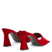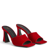 Giuseppe Zanotti Ladies Sandals. SKU: E300053-RED. Color: Red. Giuseppe Zanotti Red Solhene Velvet-Effect Mules. These mules, crafted from black synthetic velvet-effect fabric with a matching covered 85 mm spool heel, are characterized by a square toe and a leather sole featuring the logo. Outer: Fabric 100%. Sole: Leather 100%. Made in Italy. Please visit the brand website for sizing information. INFORMATION Brand: Giuseppe Zanotti Model: E300053-RED Gender: Womens DETAILS Category: Sandals Shoe Style: Mules Shoe Style: Mules Color: Red Shoe Vamp Style: Slip-on Upper Material: Fabric Sole Material: Leather Heel Size: 85mm ADDITIONAL INFO Jomashop Sku: -E300053010 Department: Shoes