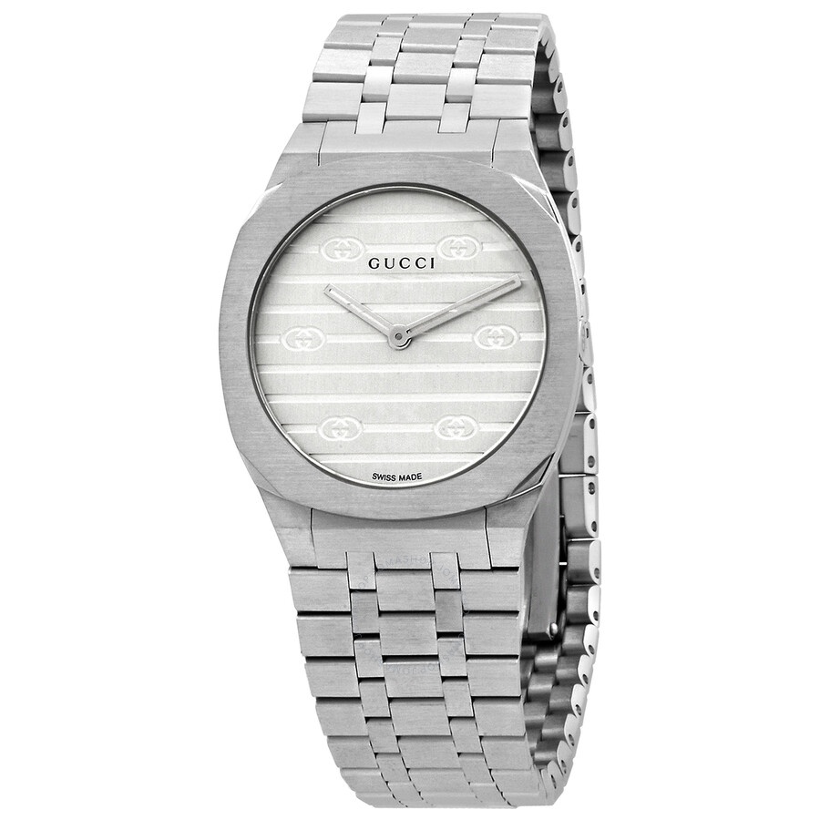 Stainless steel case with a stainless steel bracelet. Fixed stainless steel bezel. Silver dial with silver-tone hands. No markers. Dial Type: Analog. Quartz movement. Scratch resistant sapphire crystal. Solid case back. Round case shape. Case size: 30 mm. Fold over clasp with a safety release. Water resistant at 30 meters / 100 feet. Functions: hour, minute. 25h Series. Casual watch style. Watch label: Swiss Made. Gucci 25H Quartz Silver Dial Ladies Watch YA163501. INFORMATION Brand: Gucci Series: 25H Collection Name: 25H Gender: Womens Model: YA163501 Watch Label: Swiss Made Movement: Quartz CASE Case Size: 30 mm Case Material: Stainless Steel Case Shape: Round Case Back: Solid BAND Band Material: Stainless Steel Band Type: Bracelet Band Color: Silver-tone Clasp: Fold Over with Safety Release DIAL Dial Color: Silver Type: Analog Crystal: Scratch Resistant Sapphire Hands: Silver-tone Second Markers: No Markers Bezel: Fixed Bezel Color: Silver-tone Bezel Material: Stainless Steel FEATURES Water Resistance: 30 meters / 100 feet Functions: Hour, Minute Watch Features: Stainless Steel, Analog ADDITIONAL INFO Watch Style: Casual Warranty: 2 Year Jomashop Warranty UPC Code: 7319034984884 Jomashop Sku: GCYA163501 Department: Watches Category: Watches