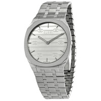 Stainless steel case with a stainless steel bracelet. Fixed stainless steel bezel. Silver dial with white skeleton hands and index hour markers. Dial Type: Analog. Quartz movement. Scratch resistant sapphire crystal. Solid case back. Round case shape. Case size: 38 mm. Band width: 25 mm. Butterfly clasp. Water resistant at 30 meters / 100 feet. Functions: hour, minute. 25h Series. Casual watch style. Watch label: Swiss Made. Gucci 25H Quartz Silver Dial Men's Watch YA163407. INFORMATION Brand: Gucci Series: 25H Collection Name: 25H Gender: Mens Model: YA163407 Watch Label: Swiss Made Movement: Quartz CASE Case Size: 38 mm Case Material: Stainless Steel Case Shape: Round Case Back: Solid BAND Band Material: Stainless Steel Band Type: Bracelet Band Color: Silver-tone Band Width: 25 mm Clasp: Butterfly DIAL Dial Color: Silver Type: Analog Crystal: Scratch Resistant Sapphire Hands: White Skeleton Dial Markers: Index Bezel: Fixed Bezel Color: Silver-tone Bezel Material: Stainless Steel FEATURES Water Resistance: 30 meters / 100 feet Functions: Hour, Minute Watch Features: Stainless Steel, Analog ADDITIONAL INFO Watch Style: Casual Warranty: 2 Year Jomashop Warranty UPC Code: 731903494664 Jomashop Sku: GCYA163407 Department: Watches Category: Watches