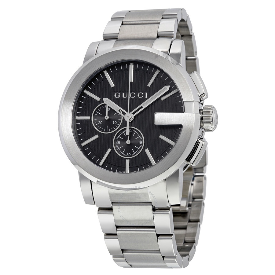 Stainless steel case with a stainless steel bracelet. Fixed G-shaped stainless steel bezel. Black dial with silver-tone hands and index hour markers. Minute markers around the outer rim. Dial Type: Analog. Chronograph - two sub-dials displaying: 60 second and 30 minute. Quartz movement. Scratch resistant sapphire crystal. Solid case back. Case diameter: 44 mm. case thickness: 13 mm. Round case shape. Bracelet width: 23 mm. Deployment clasp. Water resistant at 50 meters / 165 feet. Functions: chronograph, hour, minute, second. Sport watch style. Watch label: Swiss Made. Gucci G-Chrono Black Dial Stainless Steel Men's Watch YA101204. CASE Case Size: 44 Case Thickness: 13 mm Case Material: Stainless Steel Case Shape: Round Case Back: Solid BAND Band Material: Stainless Steel Band Type: Bracelet Band Color: Silver-tone Band Length: 8 inches Band Width: 23 mm Clasp: Deployment DIAL Dial Color: Black Type: Analog Crystal: Scratch Resistant Sapphire Hands: Luminous Silver-tone Dial Markers: Index Second Markers: Minute Markers around the outer rim Sub Dials: Two - 60 Second and 30 Minute Luminiscence: Hands and Markers Bezel: Fixed G-Shaped Bezel Color: Silver-tone Bezel Material: Stainless Steel Crown: Pull / Push INFORMATION Brand: Gucci Series: G-Chrono Collection Name: G-Chrono Gender: Mens Model: YA101204 Watch Label: Swiss Made Movement: Quartz FEATURES Water Resistance: 50 meters / 165 feet Functions: Chronograph, Hour, Minute, Second Watch Features: Analog, Stainless Steel, Chronograph ADDITIONAL INFO Watch Style: Sport Warranty: 2 Year Jomashop Warranty UPC Code: 731903358348 Jomashop Sku: GCYA101204 Department: Watches Category: Watches