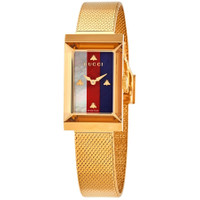 Yellow gold PVD stainless steel case with a yellow gold PVD stainless steel mesh bracelet. Fixed yellow gold PVD bezel. White, red, blue web mother of pearl dial with yellow gold-tone hands. Bee motifs mark the 3, 6, 9 and 12 o'clock positions. Dial Type: Analog. Quartz movement. Scratch resistant sapphire crystal. Pull / push crown. Solid case back. Rectangle case shape. Case dimensions: 21 mm x 34 mm. Case thickness: 7.7 mm. Band width: 14 mm. Band length: 7.75 inches. Fold over slip throgh clasp. Water resistant at 30 meters / 100 feet. Functions: hour, minute. Dress watch style. Watch label: Swiss Made. Gucci G-Frame Quartz White, Red, Blue Web Mother of Pearl Dial Ladies Watch YA147410. INFORMATION Brand: Gucci Series: G-Frame Collection Name: G-Frame Gender: Womens Model: YA147410 Watch Label: Swiss Made Movement: Quartz CASE Case Size: 21 mm x 34 mm Case Thickness: 7.7 mm Case Material: Stainless Steel Case Shape: Rectangle Case Back: Solid BAND Band Material: Stainless Steel Mesh Band Type: Bracelet Band Color: Yellow Gold PVD Band Length: 7.75 inches Band Width: 14 mm Clasp: Fold Over Slip Throgh DIAL Dial Color: White, Red, Blue Web Mother of Pearl Type: Analog Crystal: Scratch Resistant Sapphire Hands: Yellow Gold-tone Second Markers: Bee Motifs set at the 3, 6, 9 and 12 o'clock positions Bezel: Fixed Bezel Color: Yellow Gold PVD Bezel Material: Stainless Steel Crown: Pull / Push FEATURES Water Resistance: 30 meters / 100 feet Functions: Hour, Minute Watch Features: Stainless Steel, Gold, Analog ADDITIONAL INFO Watch Style: Dress Warranty: 2 Year Jomashop Warranty UPC Code: 731903463431 Jomashop Sku: GCYA147410 Department: Watches Category: Watches