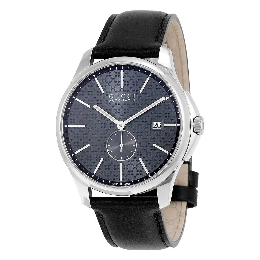 Stainless steel case with a black leather strap. Fixed stainless steel bezel. Grey (diamond pattern) dial with silver-tone hands and index hour markers. Minute markers around the outer rim. Dial Type: Analog. Date display at the 3 o'clock position. Seconds sub-dial above the 6 o'clock position. Automatic movement with a 38-hour power reserve. Scratch resistant sapphire crystal. Pull / push crown. Transparent case back. Case diameter: 40 mm. Case thickness: 9.3 mm. Round case shape. Band width: 20 mm. Band length: 8 inches. Deployment clasp. Water resistant at 50 meters / 165 feet. Functions: date, hour, minute, second. Dress watch style. Gucci G-Timeless Automatic Grey Dial Black Leather Men's Watch YA126319. CASE Case Thickness: 9.3 mm Case Material: Stainless Steel Case Shape: Round Case Back: Transparent BAND Band Material: Leather Band Type: Strap Band Color: Black Band Length: 8 inches Band Width: 20 mm Clasp: Deployment DIAL Dial Color: Grey (Diamond Pattern) Type: Analog Crystal: Scratch Resistant Sapphire Hands: Silver-tone Dial Markers: Index Second Markers: Minute Markers around the outer rim Sub Dials: One - Small Second at the 6 o'clock position Bezel: Fixed Bezel Color: Silver-tone Bezel Material: Stainless Steel Crown: Pull / Push INFORMATION Brand: Gucci Series: G-Timeless Collection Name: G-Timeless Gender: Mens Model: YA126319 Watch Label: Swiss Made Movement: Automatic Engine: ETA Caliber 2895 Power Reserve: 38 hours FEATURES Water Resistance: 50 meters / 165 feet Calendar: Date display at the 3 o'clock position Functions: Date, Hour, Minute, Second Watch Features: Leather, Stainless Steel, Diamond ADDITIONAL INFO Watch Style: Dress Warranty: 2 Year Jomashop Warranty UPC Code: 731903358249 Jomashop Sku: GCYA126319 Department: Watches Category: Watches