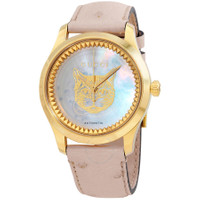 Gold-tone stainless steel case with a pink ostrich leather strap. Fixed gold-tone stainless steel bezel. Mother of pearl dial with gold-tone hands. Dial Type: Analog. ETA Caliber 2824-2 Automatic movement, based upon ETA 2824, containing 25 Jewels, bitting at 28800 vph, and has a power reserve of approximately 38 hours. Scratch resistant sapphire crystal. Screw down crown. Transparent see through case back. Round case shape, case size: 38 mm. Tang clasp. Water resistant at 50 meters / 165 feet. Functions: hour, minute, second. G-timeless Series. Dress watch style. Watch label: Swiss Movt. Gucci G-Timeless Skeleton Automatic Watch YA1264110. GENERAL Box Type: Original Box Brand Type: Designer CASE Case Size: 38 Case Material: Stainless Steel Case Shape: Round Case Back: Transparent See Through BAND Band Material: Ostrich Leather Band Type: Strap Band Color: Pink Clasp: Tang DIAL Dial Color: Mother of Pearl Type: Analog Crystal: Scratch Resistant Sapphire Hands: Gold-tone Bezel: Fixed Bezel Color: Gold-tone Bezel Material: Stainless Steel Crown: Screw Down INFORMATION Brand: Gucci Series: G-Timeless Collection Name: G-Timeless Gender: Womens Model: YA1264110 Watch Label: Swiss Movt Movement: Automatic Engine: ETA Caliber 2824-2 Power Reserve: 50 hours FEATURES Water Resistance: 50 meters / 165 feet Functions: Hour, Minute, Second Watch Features: Analog, Gold, Leather, Stainless Steel ADDITIONAL INFO Watch Style: Dress Warranty: 2 Year Jomashop Warranty Jomashop Sku: GCYA1264110 Department: Watches Category: Watches