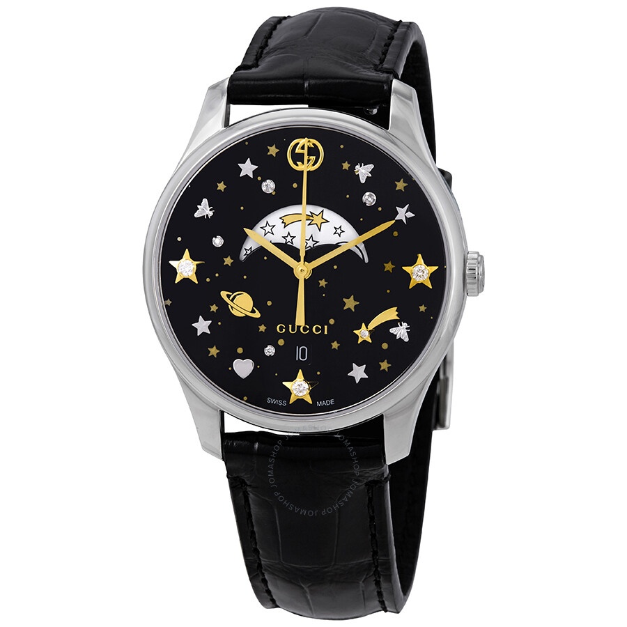 Stainless steel case with a black leather strap. Fixed stainless steel bezel. Black (crystal-set) dial with yellow gold-tone hands and house motif hour markers. Dial Type: Analog. Date display at the 6 o'clock position. Moonphase display. Case size: 36 mm. Case thickness: 8 mm. Band width: 18 mm. Tang clasp. Water resistant at 50 meters / 165 feet. Functions: date, hour, minute, second, moonphase. Casual watch style. Watch label: Swiss Made. Gucci G-Timeless Black Diamonds Dial Ladies Moonphase Watch YA1264091. GENERAL Box Type: Original Box Brand Type: Designer CASE Case Size: 36 Case Thickness: 8 mm Case Material: Stainless Steel Case Shape: Round Case Back: Solid BAND Band Material: Leather Band Type: Strap Band Color: Black Band Width: 18 mm Clasp: Tang DIAL Dial Color: Black (Crystal-set) Type: Analog Crystal: Scratch Resistant Sapphire Hands: Yellow Gold-tone Dial Markers: House Motif Sub Dials: One - Moonphase Bezel: Fixed Bezel Color: Silver-tone Bezel Material: Stainless Steel Crown: Pull / Push INFORMATION Brand: Gucci Series: G-Timeless Collection Name: G-Timeless Gender: Womens Model: YA1264091 Watch Label: Swiss Made Movement: Quartz FEATURES Water Resistance: 50 meters / 165 feet Calendar: Date display at the 6 o'clock position Functions: Date, Hour, Minute, Second, Moonphase Watch Features: Analog, Gold, Leather, Stainless Steel, Diamond ADDITIONAL INFO Watch Style: Casual Warranty: 2 Year Jomashop Warranty UPC Code: 731903458482 Jomashop Sku: GCYA1264091 Department: Watches Category: Watches