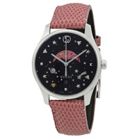 Stainless steel case with a pink (lizard) leather strap. Fixed stainless steel bezel. Black dial with silver-tone hands and Gucci motif hour markers. Dial Type: Analog. Date display at the 6 o'clock position. Moonphase display. Quartz movement. Scratch resistant sapphire crystal. Solid case back. Round case shape. Case size: 36 mm. Band width: 18 mm. Tang clasp. Water resistant at 50 meters / 165 feet. Functions: date, hour, minute, second, moonphase. Dress watch style. Watch label: Swiss Made. Gucci G-Timeless Black Moonphase Dial Ladies Watch YA1264046. CASE Case Material: Stainless Steel Case Shape: Round Case Back: Solid BAND Band Material: (Lizard) Leather Band Type: Strap Band Color: Pink Band Width: 18 mm Clasp: Tang DIAL Dial Color: Black Type: Analog Crystal: Scratch Resistant Sapphire Hands: Silver-tone Dial Markers: Gucci Motif Sub Dials: One - Moonphase Bezel: Fixed Bezel Color: Silver-tone Bezel Material: Stainless Steel INFORMATION Brand: Gucci Series: G-Timeless Collection Name: G-Timeless Gender: Womens Model: YA1264046 Watch Label: Swiss Made Movement: Quartz FEATURES Water Resistance: 50 meters / 165 feet Calendar: Date display at the 6 o'clock position Functions: Date, Hour, Minute, Second, Moonphase Watch Features: Analog, Leather, Stainless Steel ADDITIONAL INFO Watch Style: Dress Warranty: 2 Year Jomashop Warranty UPC Code: 731903409293 Jomashop Sku: GCYA1264046 Department: Watches Category: Watches