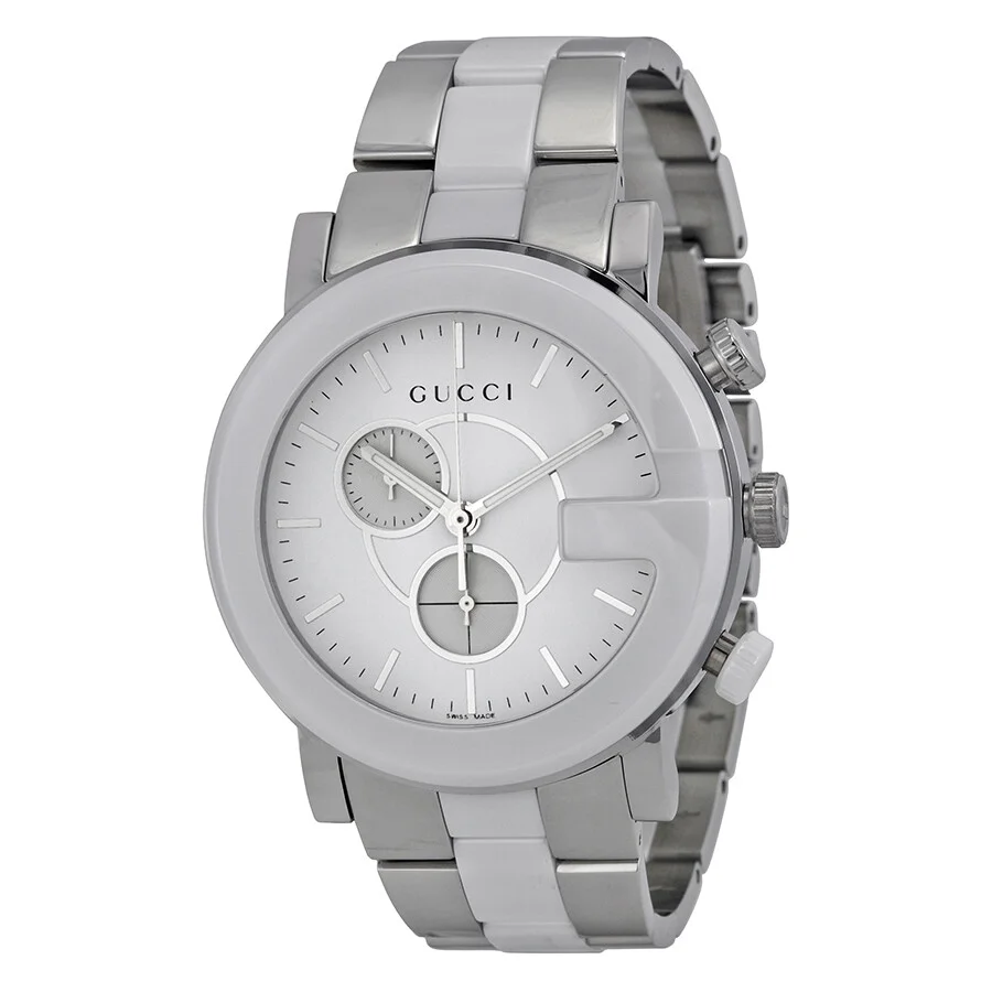 Polished steel case with a stainless steel bracelet with white ceramic center links. Fixed white ceramic G-shaped bezel. White dial with luminous hands and index hour markers. Minute markers around the outer rim. Dial Type: Analog. Chronograph - two sub-dials displaying: 60 second and 30 minute. Quartz movement. Scratch resistant sapphire crystal. Case diameter: 44 mm. Round case shape. Deployment clasp. Water resistant at 30 meters / 100 feet. Functions: chronograph, hour, minute, second. Sport watch style. Gucci G-Timeless White Dial Chronograph Steel and Ceramic Men's Watch YA101345. GENERAL Color: White CASE Case Thickness: 12.5 mm Case Material: Polished Steel Case Shape: Round Case Back: Solid BAND Band Material: Stainless Steel and White Ceramic Band Type: Bracelet Band Color: Two-tone (Silver-tone and White) Band Length: 8 inches Band Width: 23 mm Clasp: Deployment DIAL Dial Color: White Type: Analog Crystal: Scratch Resistant Sapphire Hands: Luminous Dial Markers: Index Second Markers: Minute Markers around the outer rim Sub Dials: Two - 60 Second and 30 Minute Bezel: Fixed Bezel Color: White Bezel Material: Ceramic Crown: Pull / Push INFORMATION Brand: Gucci Series: G-Chrono Collection Name: G-Chrono Gender: Mens Model: YA101345 Watch Label: Swiss Made Movement: Quartz FEATURES Water Resistance: 30 meters / 100 feet Functions: Chronograph, Hour, Minute, Second Watch Features: Analog, Ceramic, Stainless Steel, Chronograph ADDITIONAL INFO Watch Style: Sport Warranty: 2 Year Jomashop Warranty UPC Code: 731903327252 Jomashop Sku: GCYA101345 Department: Watches Category: Watches