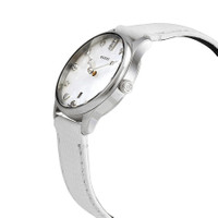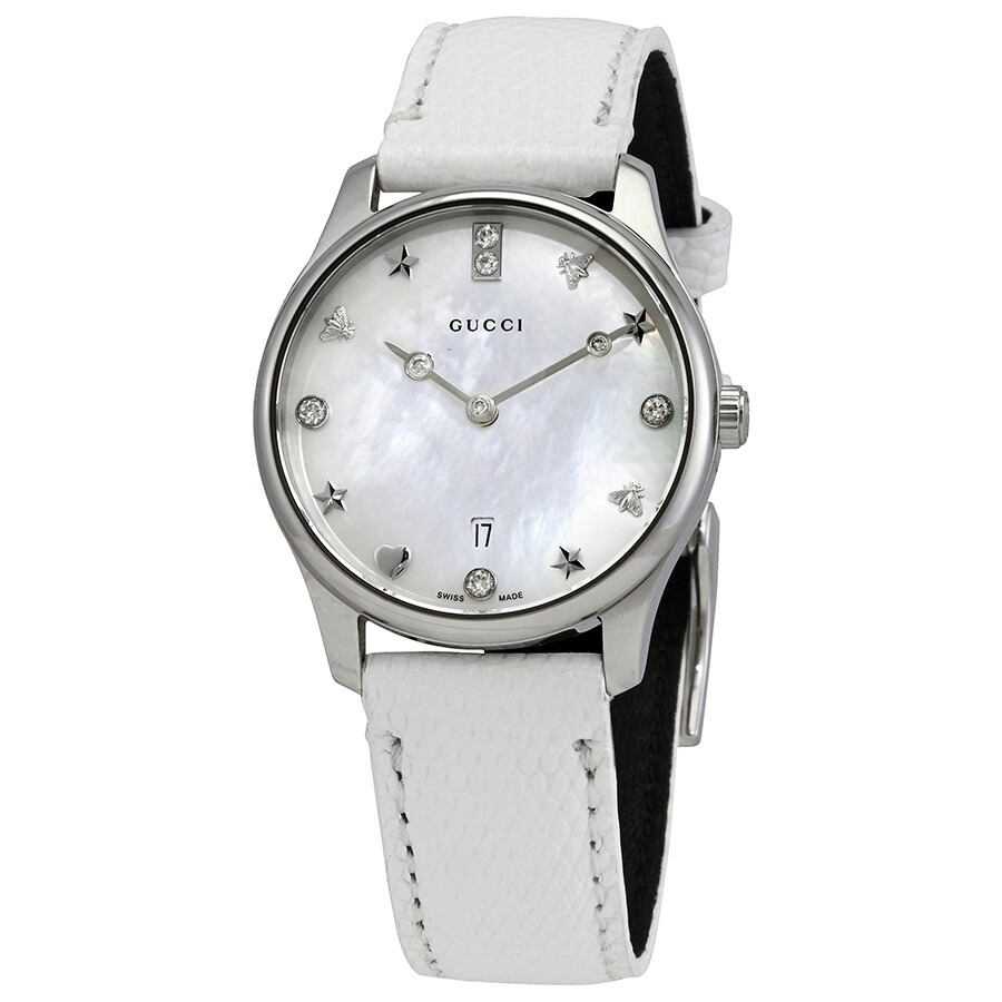 Stainless steel case with a white (lizard) leather strap. Fixed stainless steel bezel. Mother of pearl dial with silver-tone hands and star and bee index hour markers. Diamonds set at the 3, 6, 9 and 12 o'clock positions. Dial Type: Analog. Date display at the 6 o'clock position. Quartz movement. Scratch resistant sapphire crystal. Pull / push crown. Solid case back. Round case shape. Case size: 29 mm. Case thickness: 8 mm. Band width: 14 mm. Tang clasp. Water resistant at 50 meters / 165 feet. Functions: date, hour, minute, second. Dress watch style. Watch label: Swiss Made. Gucci G-Timeless Mother of Pearl Dial Ladies Watch YA126597. GENERAL Box Type: Original Box Brand Type: Designer CASE Case Diameter: 29 mm Case Thickness: 8 mm Case Material: Stainless Steel Case Shape: Round Case Back: Solid BAND Band Material: (Lizard) Leather Band Type: Strap Band Color: White Band Width: 14 mm Clasp: Tang DIAL Dial Color: Mother of Pearl Type: Analog Crystal: Scratch Resistant Sapphire Hands: Silver-tone Dial Markers: Star and Bee Index Second Markers: Diamonds set at the 3, 6, 9 and 12 o'clock positions Bezel: Fixed Bezel Color: Silver-tone Bezel Material: Stainless Steel Crown: Pull / Push INFORMATION Brand: Gucci Series: G-Timeless Collection Name: G-Timeless Gender: Womens Model: YA126597 Watch Label: Swiss Made Movement: Quartz FEATURES Water Resistance: 50 meters / 165 feet Calendar: Date display at the 6 o'clock position Functions: Date, Hour, Minute, Second Watch Features: Analog, Leather, Stainless Steel, Diamond ADDITIONAL INFO Watch Style: Dress Warranty: 2 Year Jomashop Warranty UPC Code: 731903458512 Jomashop Sku: GCYA126597 Department: Watches Category: Watches