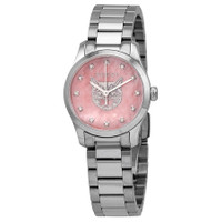 Stainless steel case with a stainless steel bracelet. Fixed stainless steel bezel. Pink mother of pearl (mystic cat) dial with silver-tone hands and diamond hour markers. Dial Type: Analog. Quartz movement. Scratch resistant sapphire crystal. Pull / push crown. Solid case back. Round case shape. Case size: 27 mm. Bracelet width: 15 mm. Deployment clasp. Functions: hour, minute, second. G-timeless Series. Dress watch style. Watch label: Swiss Made. Gucci G-Timeless Quartz Watch YA1265025. INFORMATION Brand: Gucci Series: G-Timeless Collection Name: G-Timeless Gender: Womens Model: YA1265025 Watch Label: Swiss Made Movement: Quartz CASE Case Size: 27 mm Case Material: Stainless Steel Case Shape: Round Case Back: Solid BAND Band Material: Stainless Steel Band Type: Bracelet Band Color: Silver-tone Band Width: 15 mm Clasp: Deployment DIAL Dial Color: Pink Mother of Pearl (Mystic Cat) Type: Analog Crystal: Scratch Resistant Sapphire Hands: Silver-tone Dial Markers: Diamond Bezel: Fixed Bezel Color: Silver-tone Bezel Material: Stainless Steel Crown: Pull / Push FEATURES Functions: Hour, Minute, Second Watch Features: Diamond, Stainless Steel, Analog ADDITIONAL INFO Watch Style: Dress Warranty: 2 Year Jomashop Warranty UPC Code: 7319034849558 Jomashop Sku: GCYA1265025 Department: Watches Category: Watches