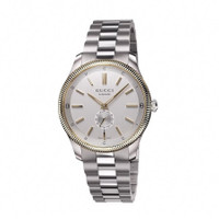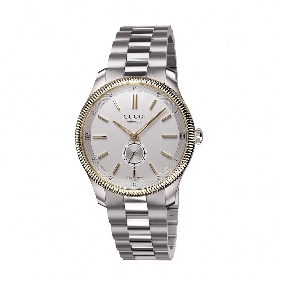 Silver-tone stainless steel case and bracelet. Fixed gold-tone stainless steel bezel. Silver dial with gold-tone hands and index hour markers. Dial Type: Analog. Luminescent hands and markers. Quartz movement. Scratch resistant sapphire crystal. Solid case back. Round case shape, case size: 40 mm. Fold over clasp with a safety release. Functions: hour, minute, second. G-timeless Series. Sport watch style. Watch label: Swiss Made. Gucci G-Timeless Quartz Silver Dial Men's Watch YA126390. GENERAL Box Type: Original Box Brand Type: Designer CASE Case Material: Stainless Steel Case Shape: Round Case Back: Solid BAND Band Material: Stainless Steel Band Type: Bracelet Band Color: Silver-tone Clasp: Fold Over with Safety Release DIAL Dial Color: Silver Type: Analog Crystal: Scratch Resistant Sapphire Hands: Gold-tone Dial Markers: Index Luminiscence: Hands and Markers Bezel: Fixed Bezel Color: Gold-tone Bezel Material: Stainless Steel INFORMATION Brand: Gucci Series: G-Timeless Collection Name: G-Timeless Gender: Mens Model: YA126390 Watch Label: Swiss Made Movement: Quartz FEATURES Functions: Hour, Minute, Second Watch Features: Analog, Gold, Stainless Steel ADDITIONAL INFO Watch Style: Sport Warranty: 2 Year Jomashop Warranty Jomashop Sku: GCYA126390 Department: Watches