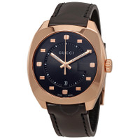 Rose gold-tone stainless steel case with a black leather strap. Fixed rose gold-tone bezel. Black dial with luminous rose gold-tone hands and index hour markers. Minute markers around an inner ring. Dial Type: Analog. Luminescent hands. Date display at the 6 o'clock position. Quartz movement. Scratch resistant sapphire crystal. Pull / push crown. Solid case back. Cushion case shape. Case size: 41 mm. Case thickness: 10.3 mm. Band width: 20 mm. Band length: 7 inches. Tang clasp. Water resistant at 50 meters / 165 feet. Functions: date, hour, minute, second. Dress watch style. Watch label: Swiss Made. Gucci GG2570 Black Dial Rose Gold-tone Men's Watch YA142309. GENERAL Box Type: Original Box Brand Type: Designer CASE Case Diameter: 41 Case Thickness: 10.3 mm Case Material: Stainless Steel Case Shape: Cushion Case Back: Solid BAND Band Material: Leather Band Type: Strap Band Color: Black Band Length: 7 inches Band Width: 20 mm Clasp: Tang DIAL Dial Color: Black Type: Analog Crystal: Scratch Resistant Sapphire Hands: Luminous Rose Gold-tone Dial Markers: Index Second Markers: Minute Markers around an inner ring Luminiscence: Hands Bezel: Fixed Bezel Color: Rose Gold-tone Bezel Material: Stainless Steel Crown: Pull / Push INFORMATION Brand: Gucci Series: Gg2570 Collection Name: GG2570 Gender: Mens Model: YA142309 Watch Label: Swiss Made Movement: Quartz FEATURES Water Resistance: 50 meters / 165 feet Calendar: Date display at the 6 o'clock position Functions: Date, Hour, Minute, Second Watch Features: Analog, Gold, Leather, Stainless Steel ADDITIONAL INFO Watch Style: Dress Warranty: 2 Year Jomashop Warranty UPC Code: 731903385283 Jomashop Sku: GCYA142309 Department: Watches Category: Watches