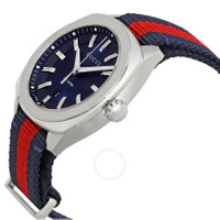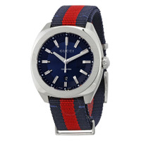 Stainless steel case with a blue and red stripe nylon strap. Fixed stainless steel bezel. Blue dial with luminous silver-tone hands and index hour markers. Minute markers around the outer rim. Dial Type: Analog. Luminescent hands and markers. Date display at the 6 o'clock position. Quartz movement. Scratch resistant sapphire crystal. Solid case back. Case size: 41 mm. Case thickness: 13 mm. Cushion case shape. Band width: 17.75 mm. Band length: 7.5 inches. Tang clasp. Water resistant at 100 meters / 330 feet. Functions: date, hour, minute, second. Luxury watch style. Watch label: Swiss Made. Gucci GG2570 Blue Dial Blue and Red Nylon Men's Watch YA142304. CASE Case Size: 41 Case Thickness: 13 mm Case Material: Stainless Steel Case Shape: Cushion Case Back: Solid BAND Band Material: Nylon Band Type: Strap Band Color: Blue and Red Stripe Band Length: 7.5 inches Band Width: 17.75 mm Clasp: Tang DIAL Dial Color: Blue Type: Analog Crystal: Scratch Resistant Sapphire Hands: Luminous Silver-tone Dial Markers: Index Second Markers: Minute Markers around the outer rim Luminiscence: Hands and Markers Bezel: Fixed Bezel Color: Silver-tone Bezel Material: Stainless Steel Crown: Pull / Push INFORMATION Brand: Gucci Series: Gg2570 Collection Name: GG2570 Gender: Mens Model: YA142304 Watch Label: Swiss Made Movement: Quartz FEATURES Water Resistance: 100 meters / 330 feet Calendar: Date display at the 6 o'clock position Functions: Date, Hour, Minute, Second Watch Features: Stainless Steel, Analog ADDITIONAL INFO Watch Style: Luxury Warranty: 2 Year Jomashop Warranty UPC Code: 731903382404 Jomashop Sku: GCYA142304 Department: Watches Category: Watches